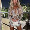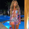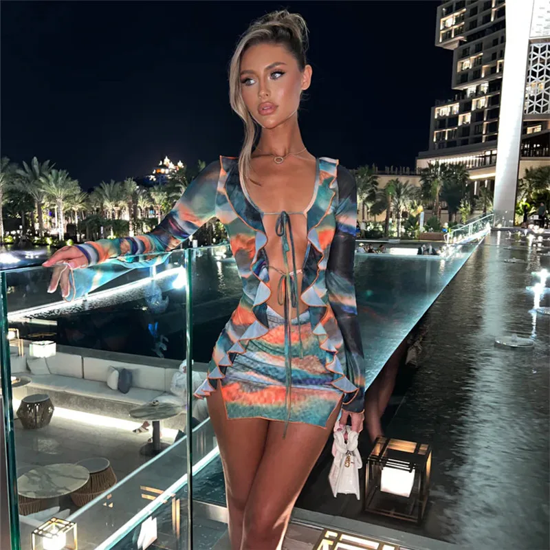 Fleepmart Women Ruffle Mini Sexy Deep V Neck Cutout Mesh See Through Bodycon Short Tie Dye Summer Beach Sundress