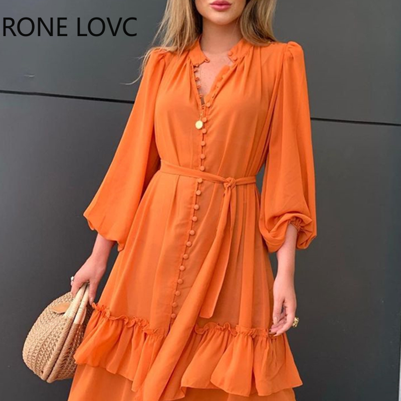 fleepmart Women Ruffles Frill Hem Lantern Sleeve Button Front Dress Casual Dress Summer Dress
