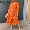 fleepmart Women Ruffles Frill Hem Lantern Sleeve Button Front Dress Casual Dress Summer Dress