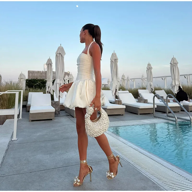 Fleepmart Women Sexy Backless Halter Mini Dress Elegant Sleeveless Puff Pleated Hem A-line Dresses 2024 Lady Slim Solid Party Evening Robe