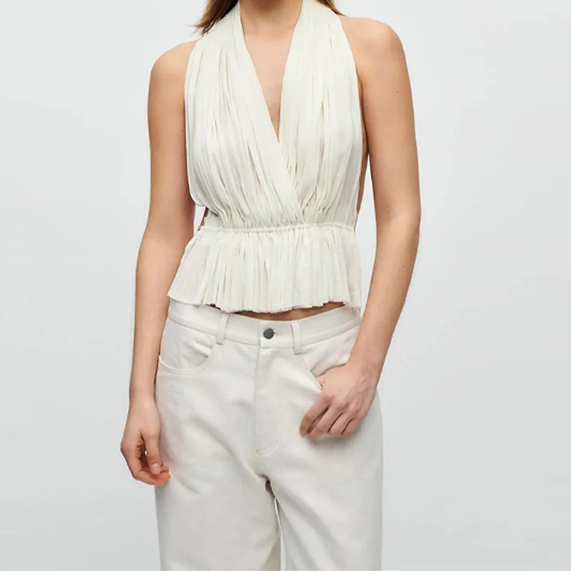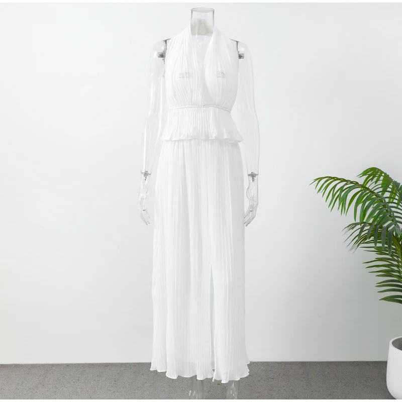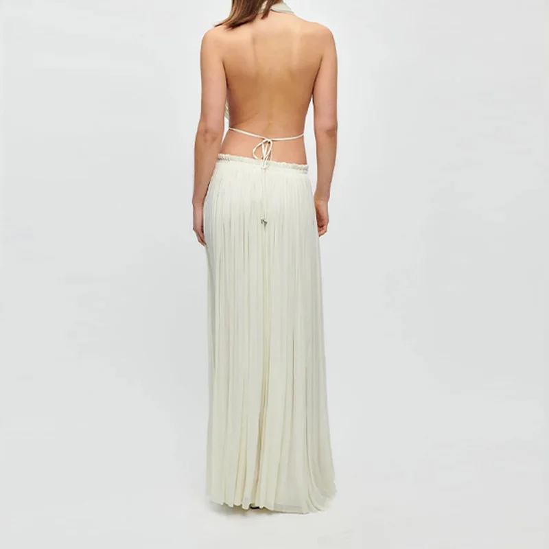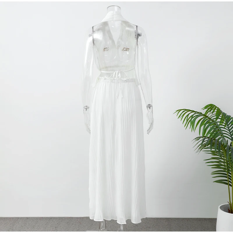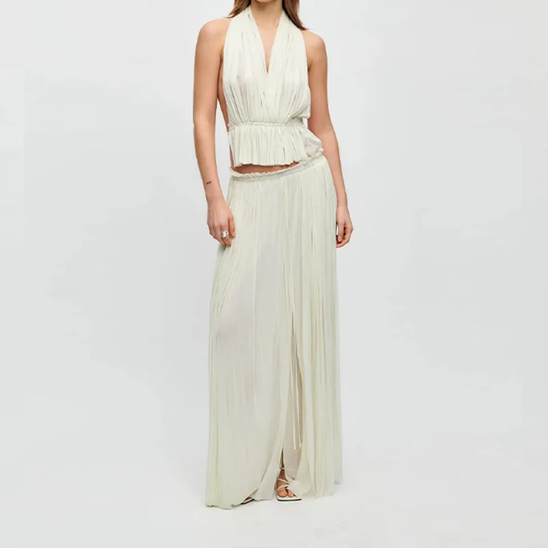 Fleepmart Women Sexy Gauze Halter Pleated Cropped Tank Tops Suits Chic Backless Splited Elastic Waist Long Skirts 2 Pcs Sets Lady Outfits