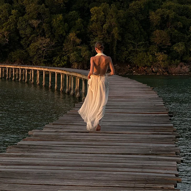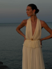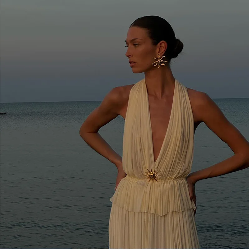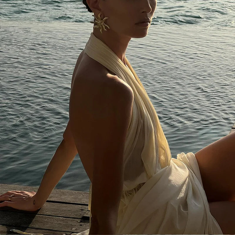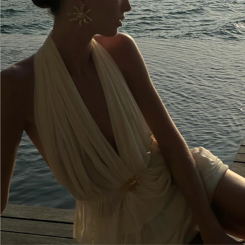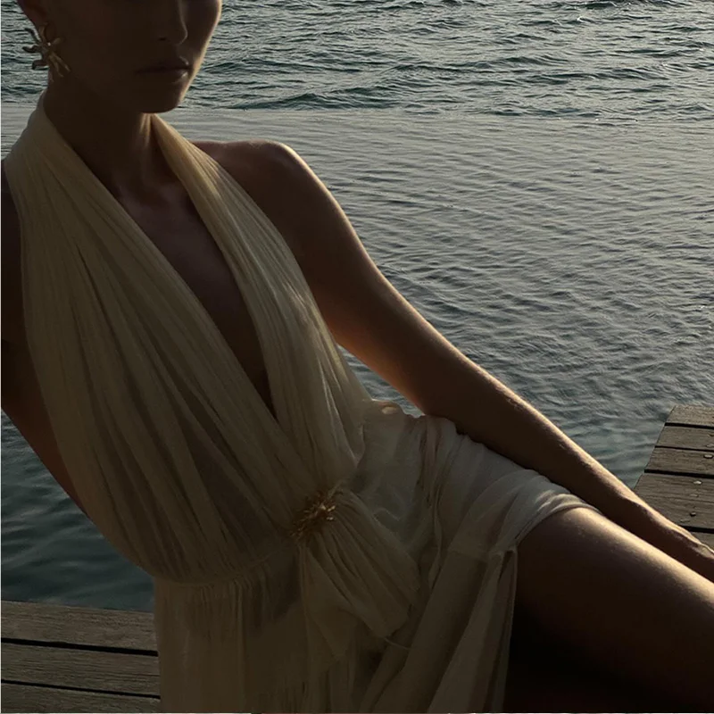 Fleepmart Women Sexy Gauze Halter Pleated Cropped Tank Tops Suits Chic Backless Splited Elastic Waist Long Skirts 2 Pcs Sets Lady Outfits