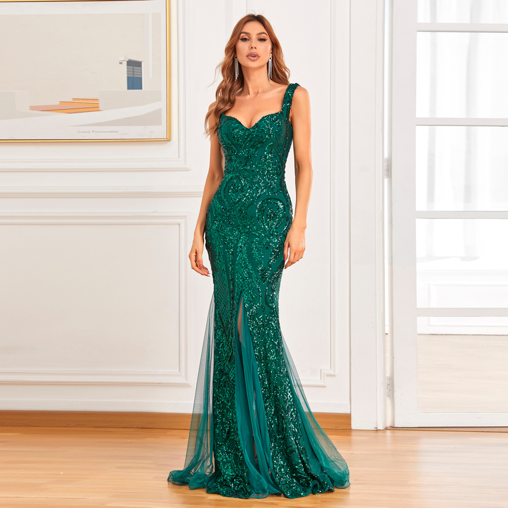 Fleepmart Women Sexy Green Sequin Evening Dress Sleeveless Formal Party Maxi Dress Long Prom Dress