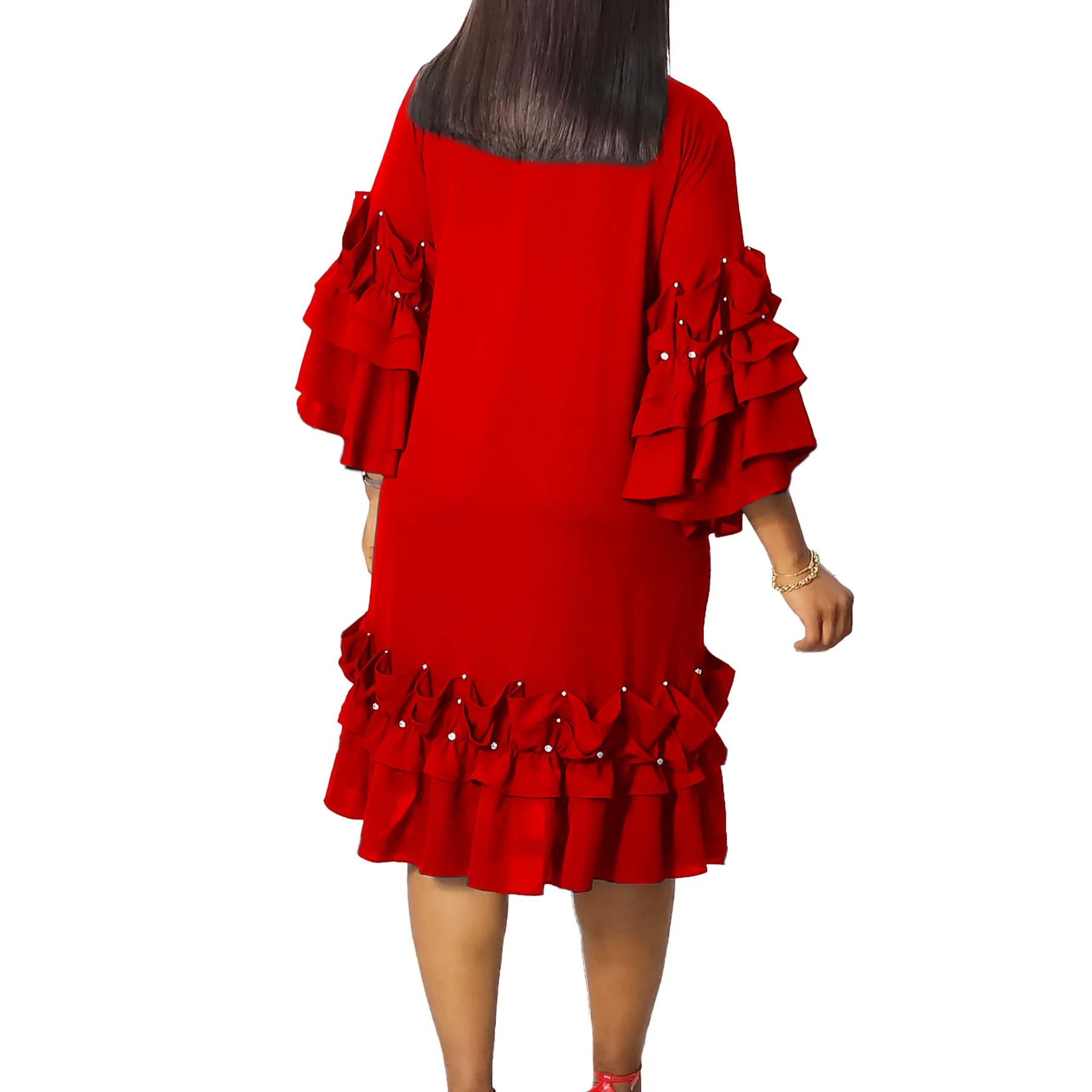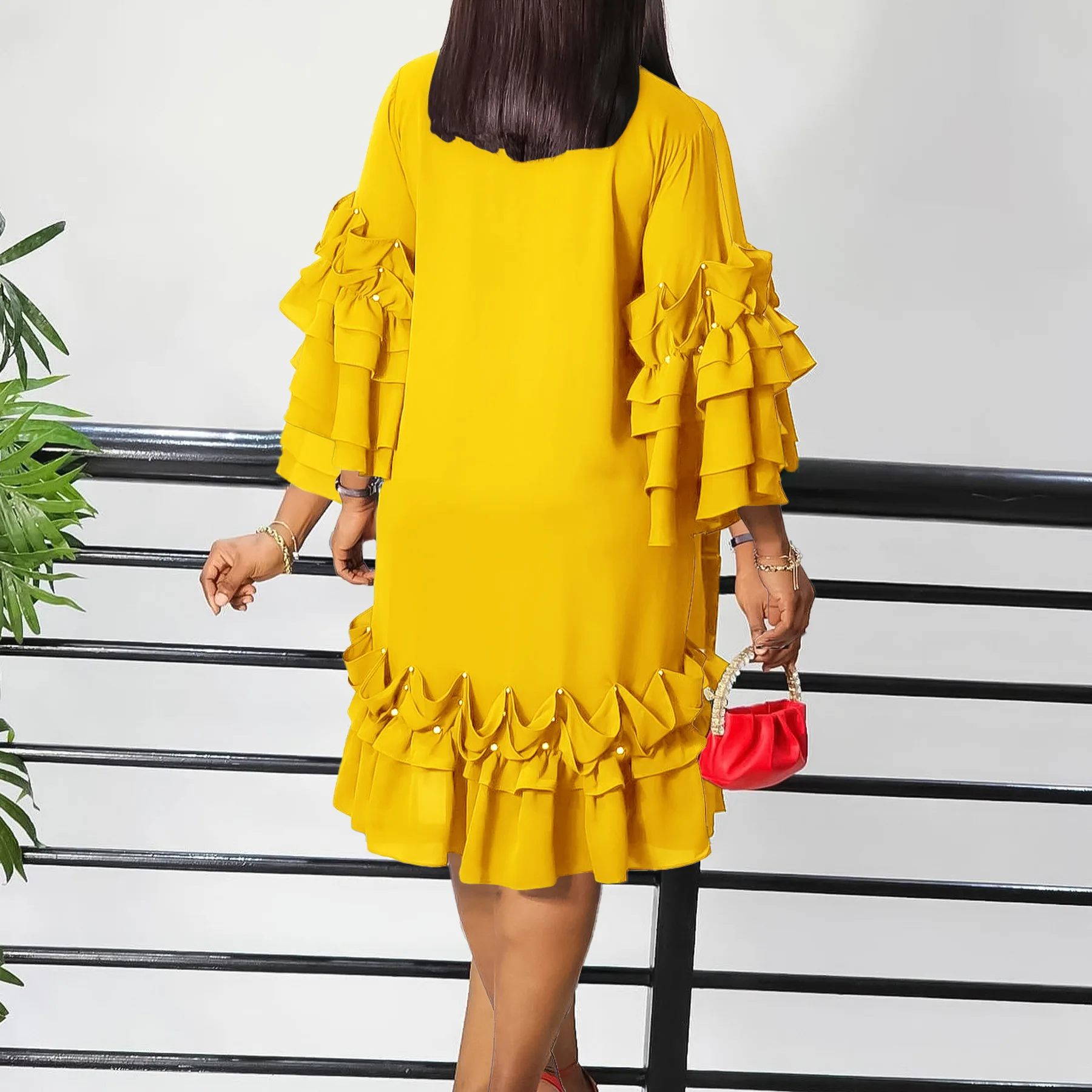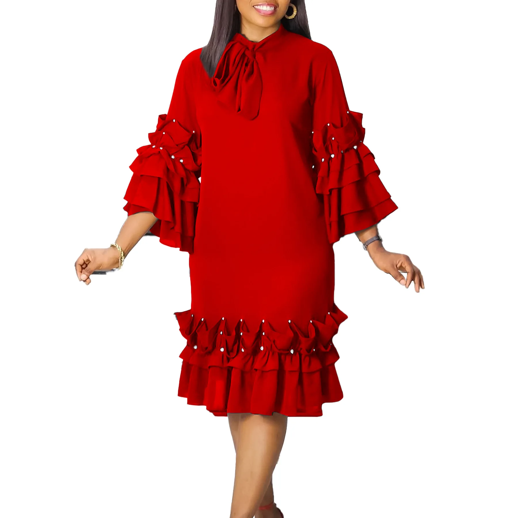 Fleepmart Women Shirt Dress Loose 4 3 Sleeves Pleated Ruffles Bow Collar Elegant Ladies African Spring Summer Office Work Wear Church Gown