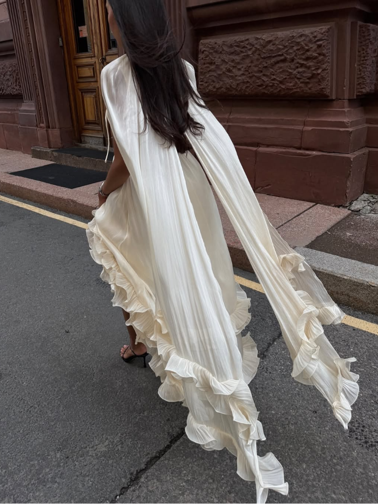 The layered ruffles extend to the hem of the skirt, swaying beautifully in the wind