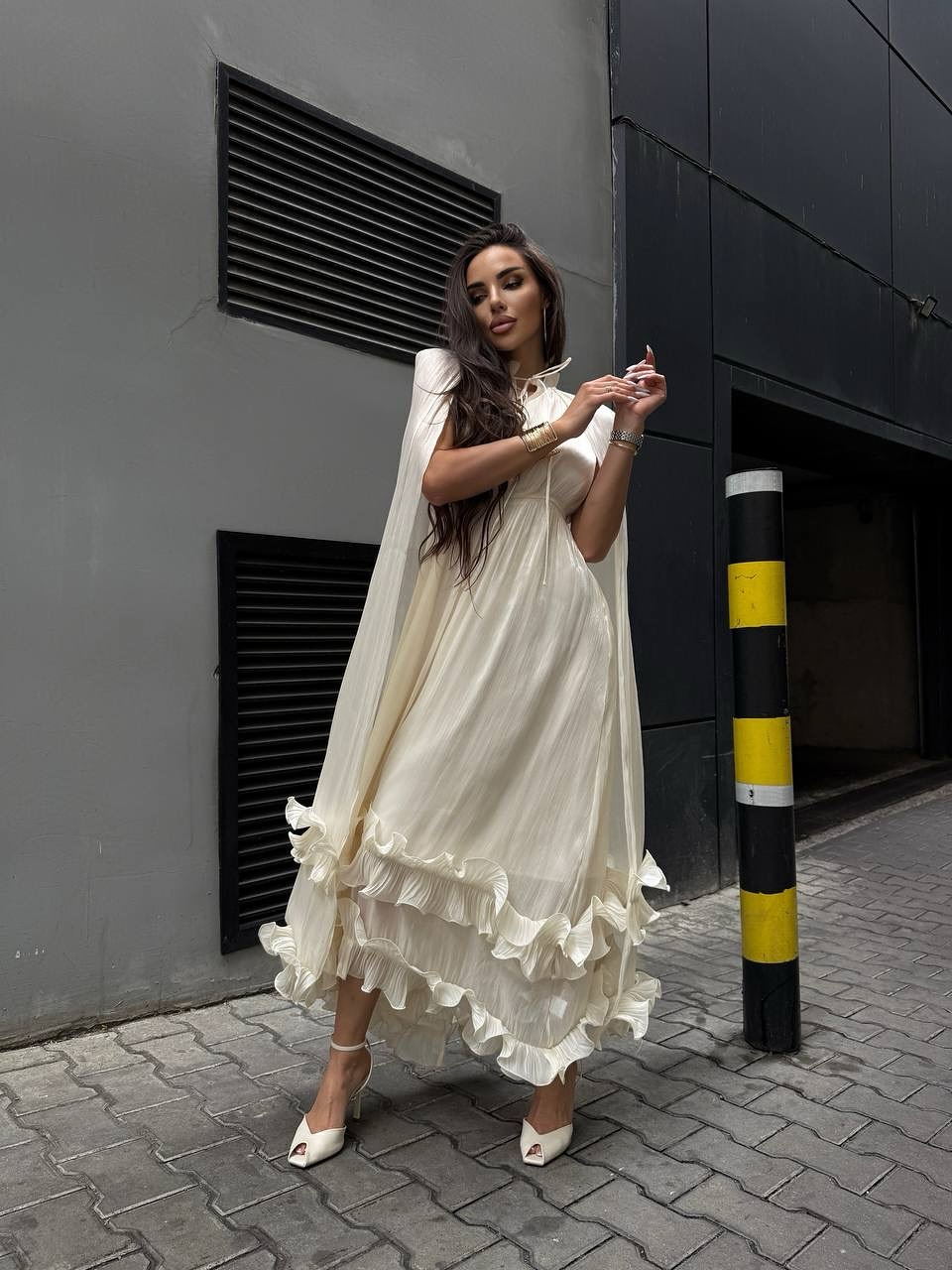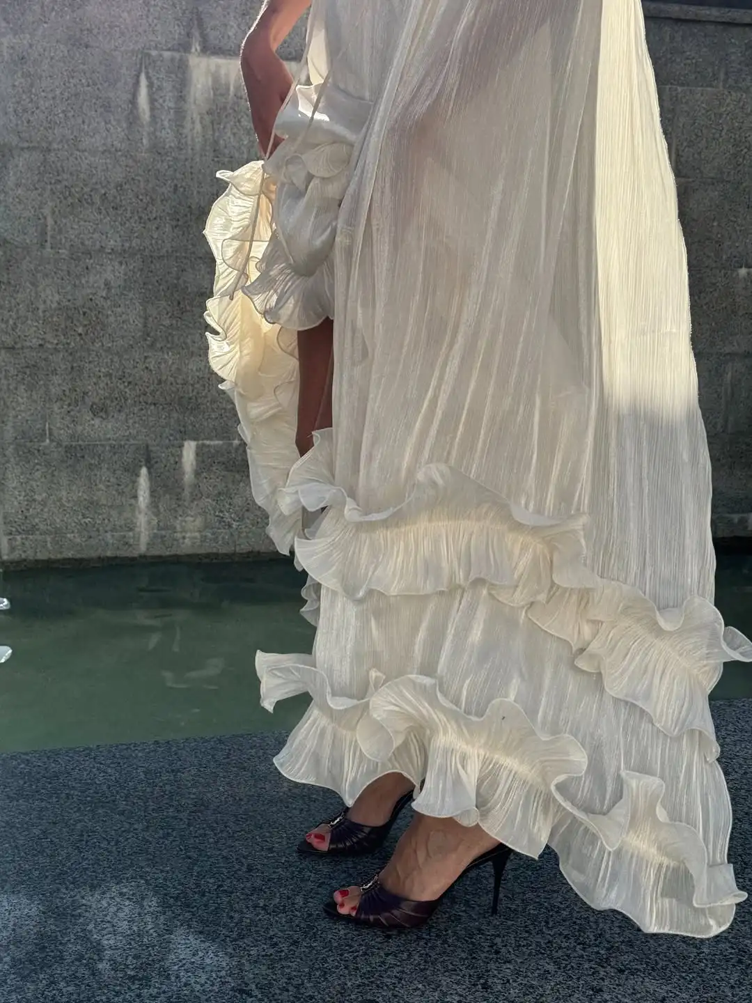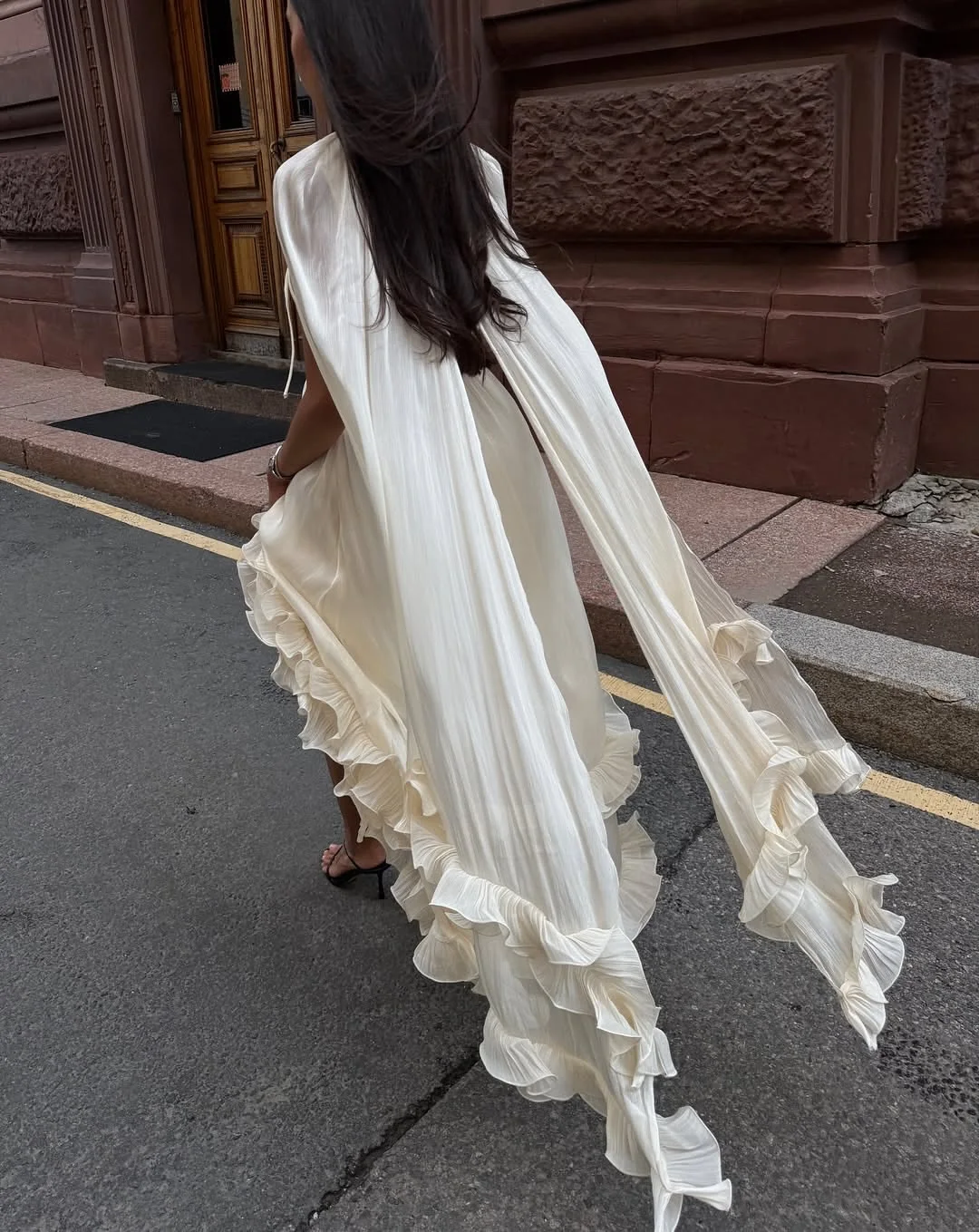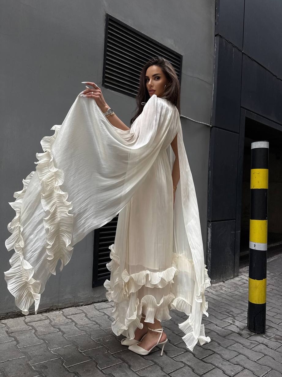The layered ruffles extend to the hem of the skirt, swaying beautifully in the wind