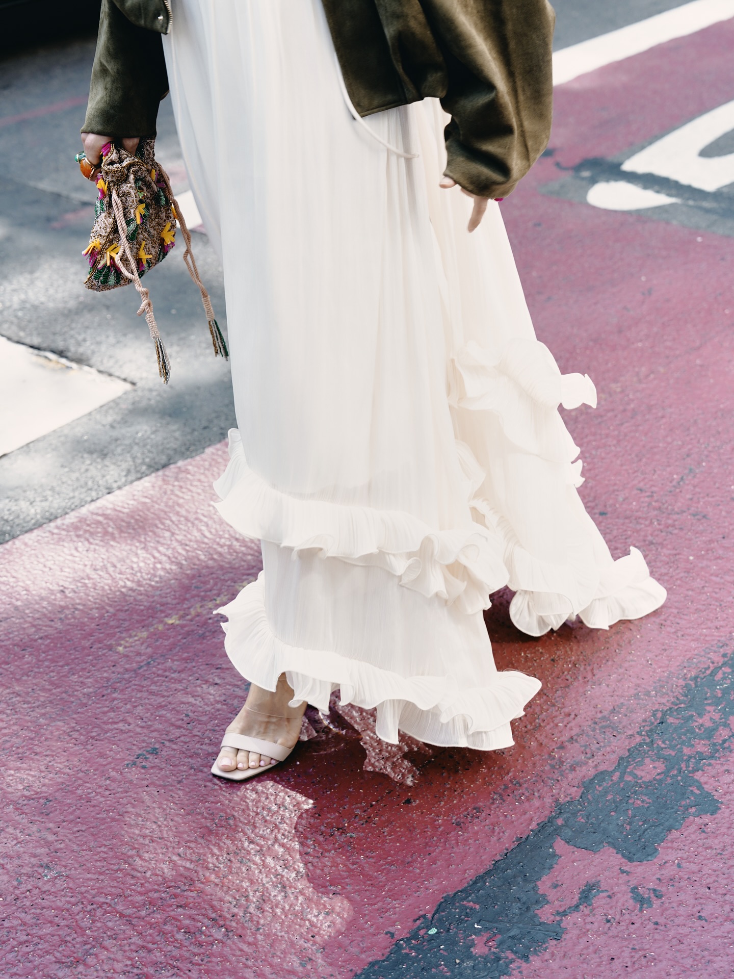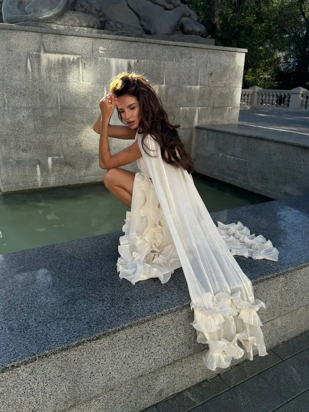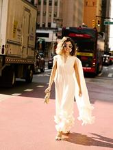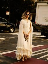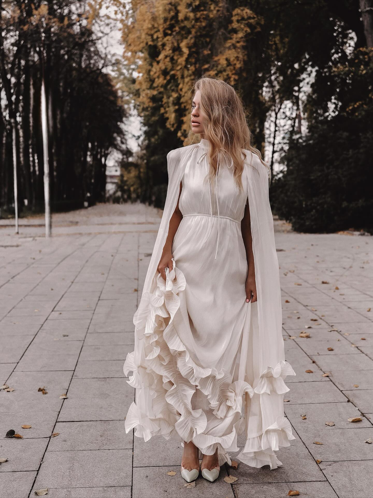 The layered ruffles extend to the hem of the skirt, swaying beautifully in the wind