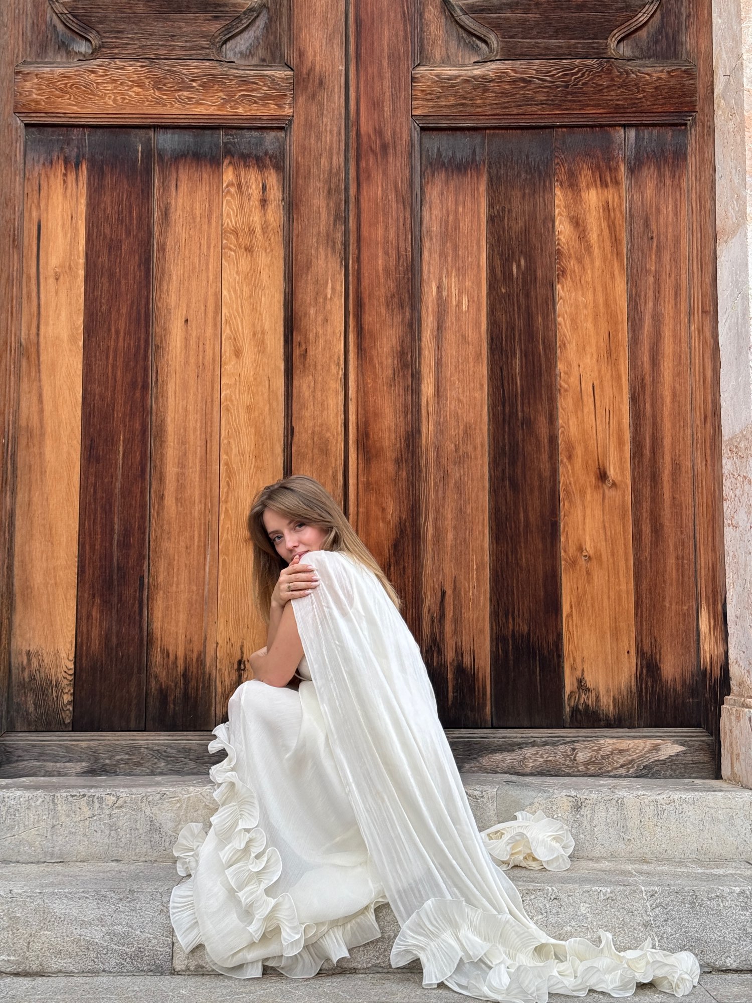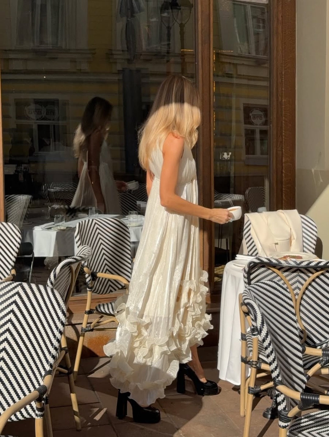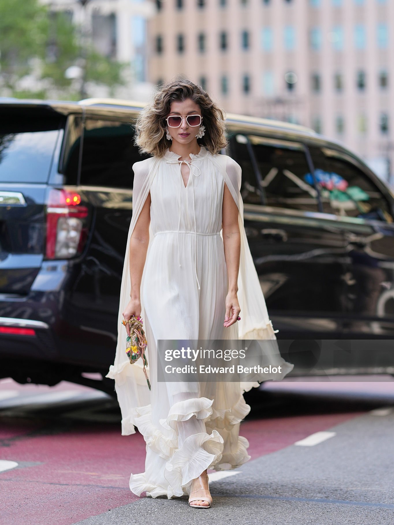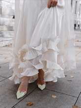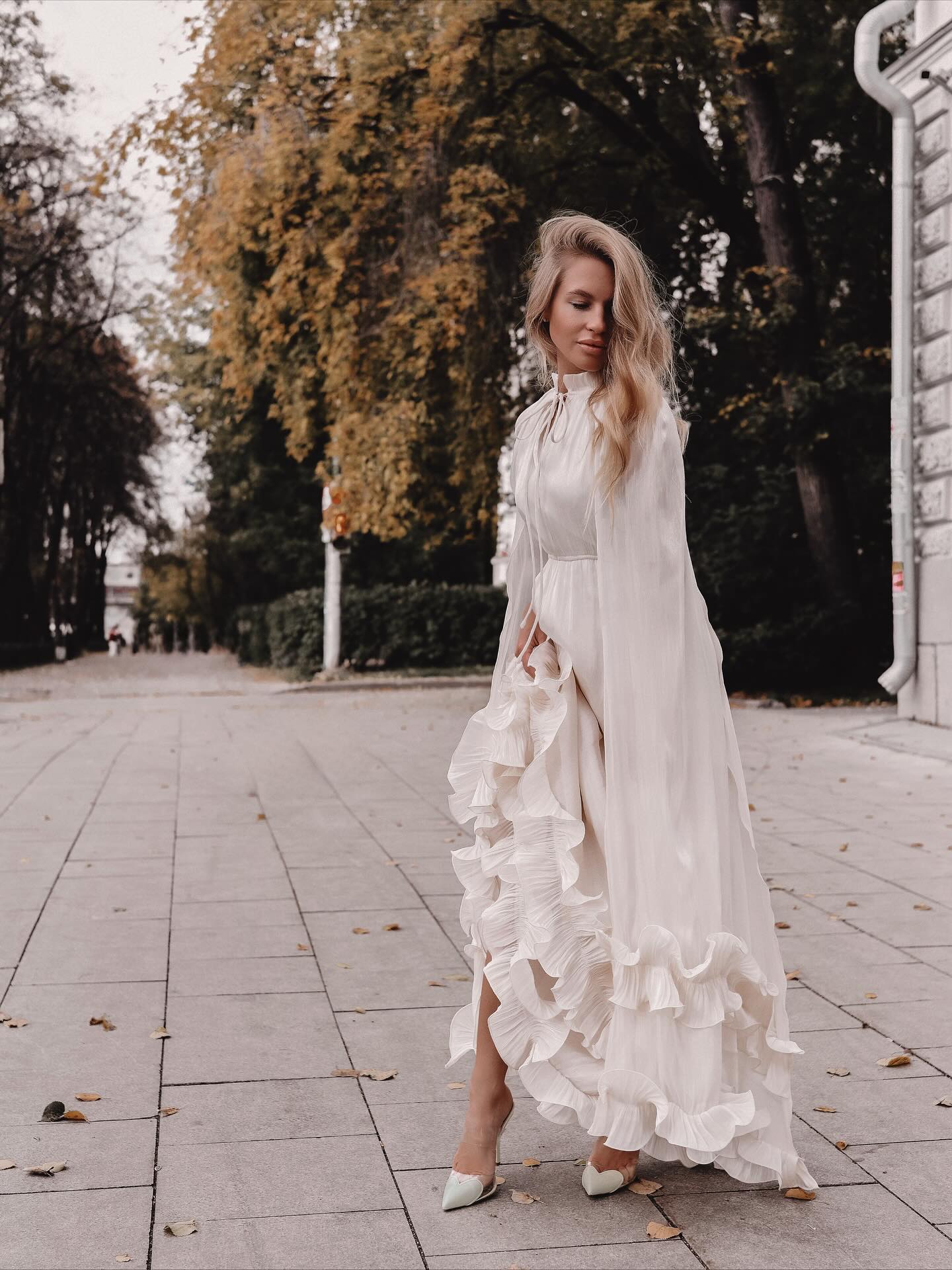 The layered ruffles extend to the hem of the skirt, swaying beautifully in the wind