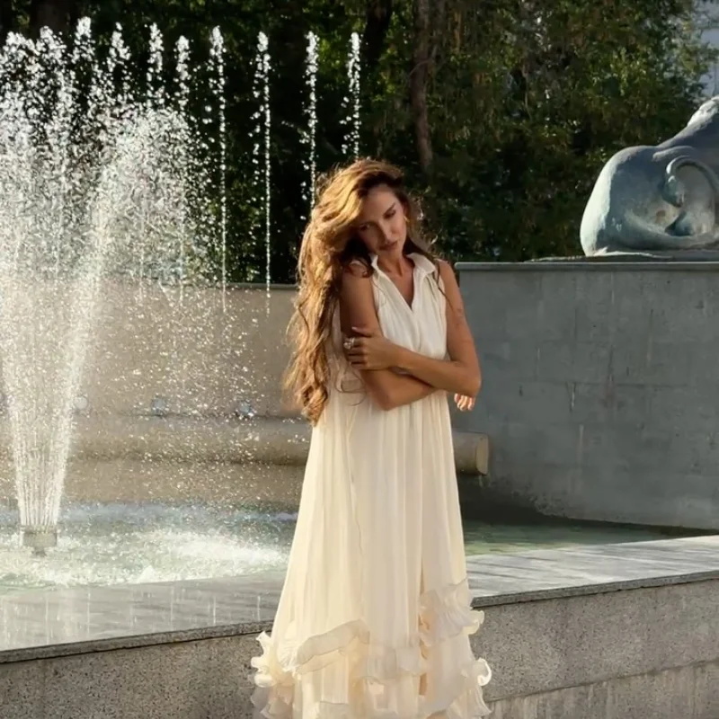 Fleepmart Women Solid Ruffle Maxi Dress Fashion Lapel V-neck Sleeveless Pleated High Waist Chic Dresses 2025 Summer Lady Vacation Robes
