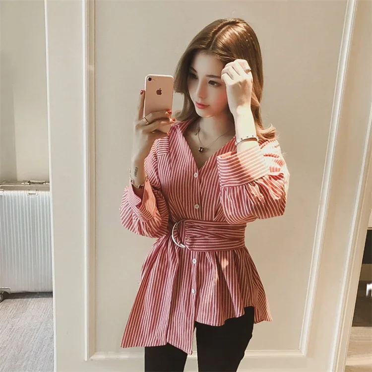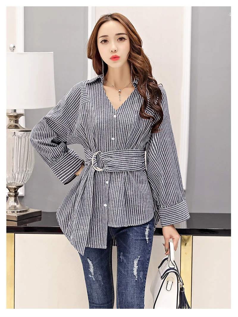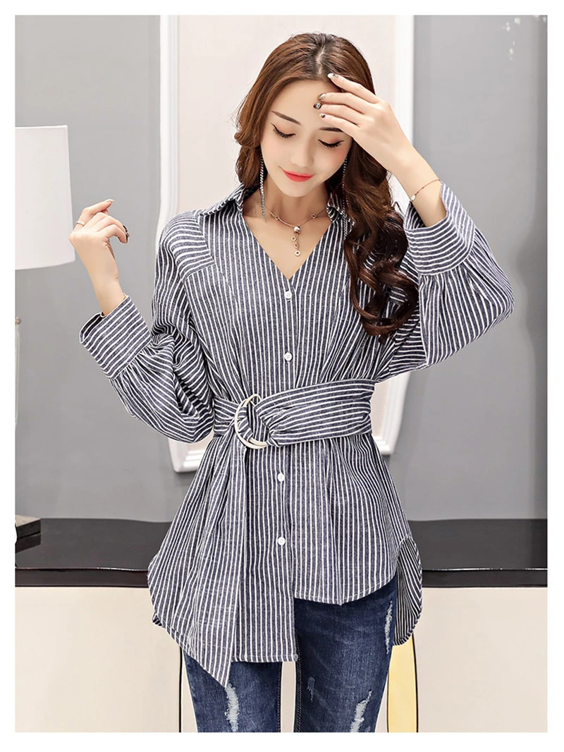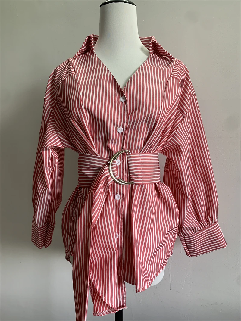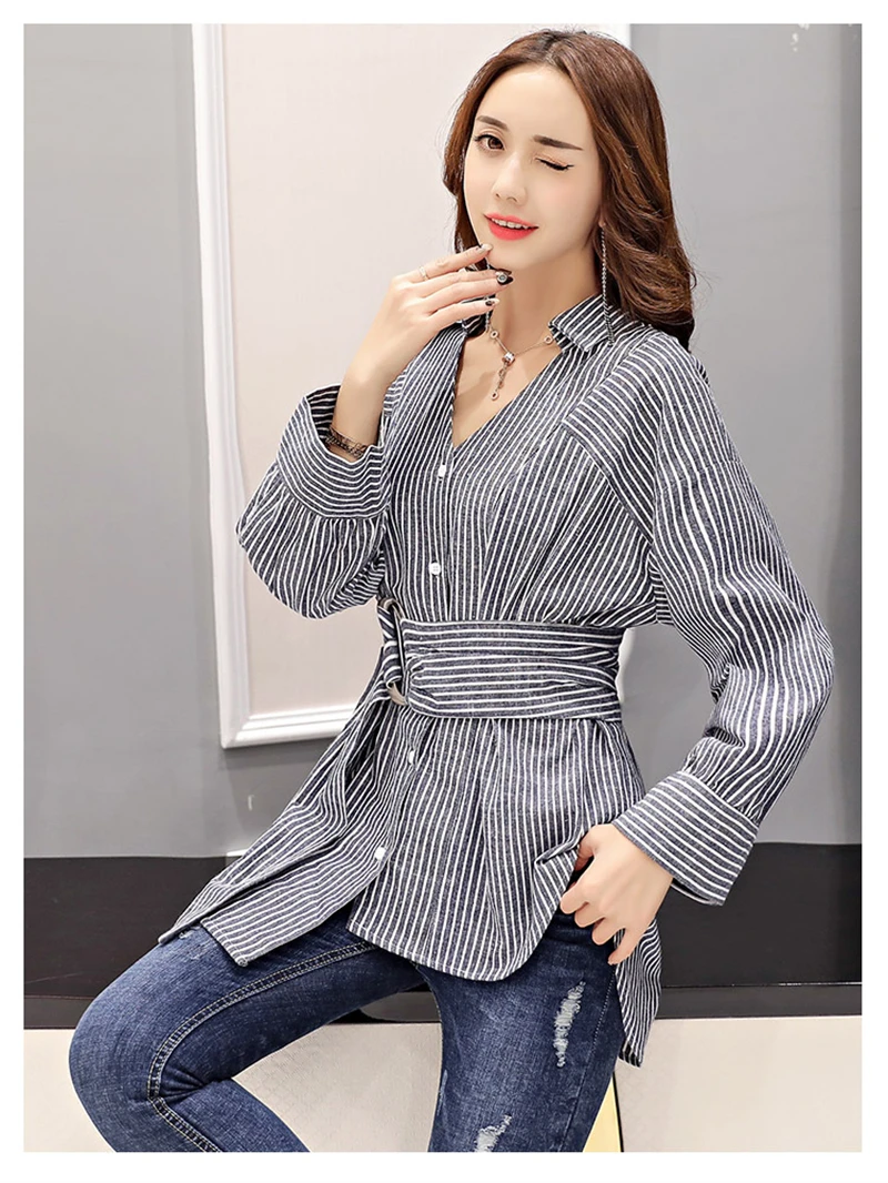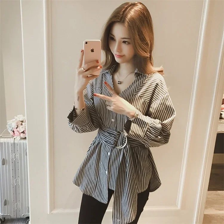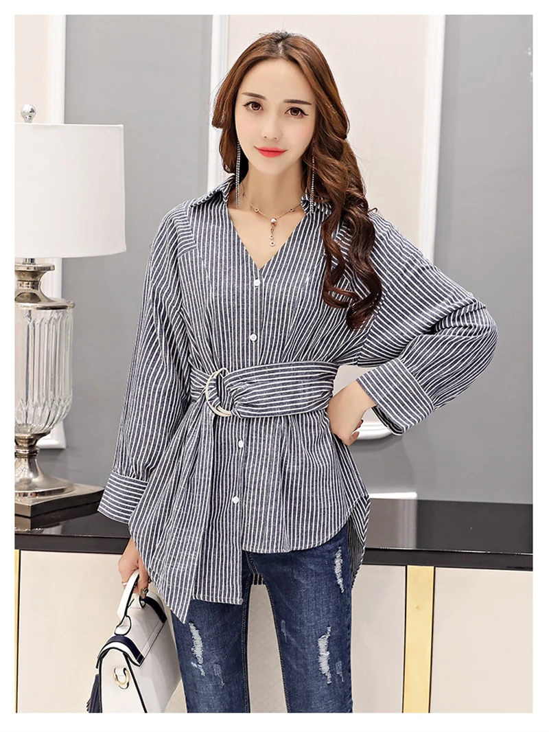 Fleepmart Women Striped Shirt With Belt Casual Tops Autumn Long Sleeve Turn-down Collar Button-up Loose Blouse Casual Oversize Streetwear