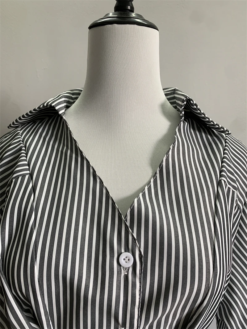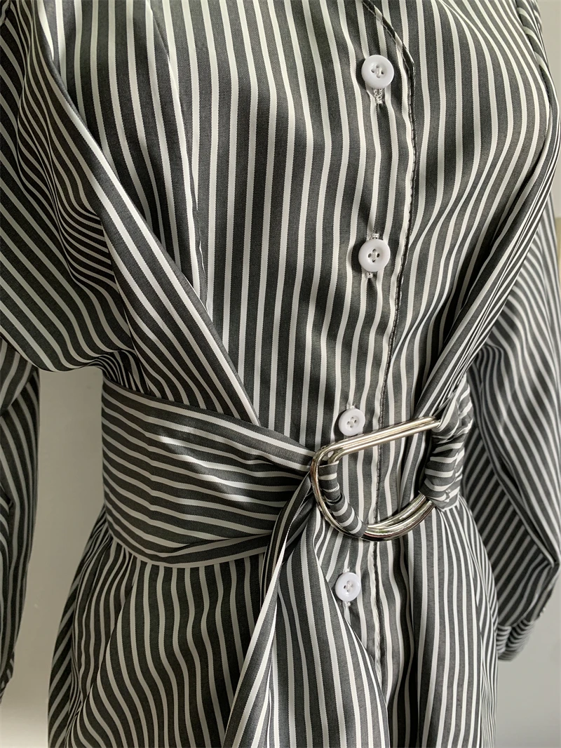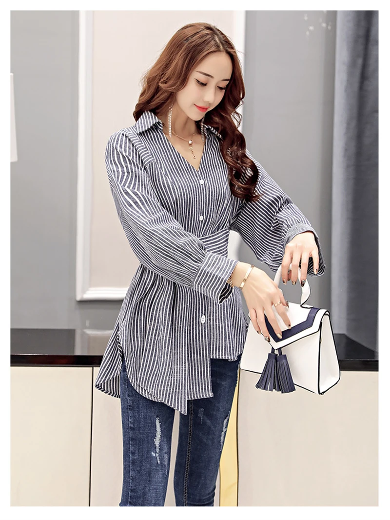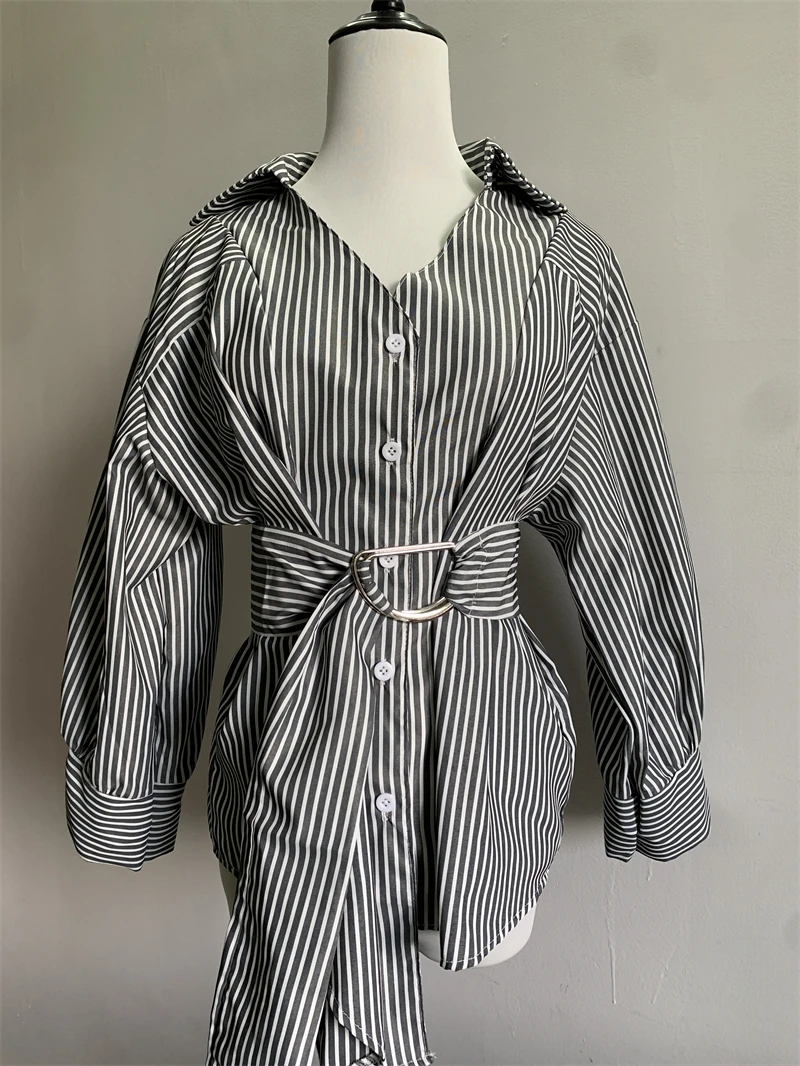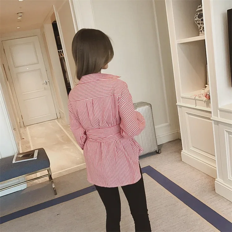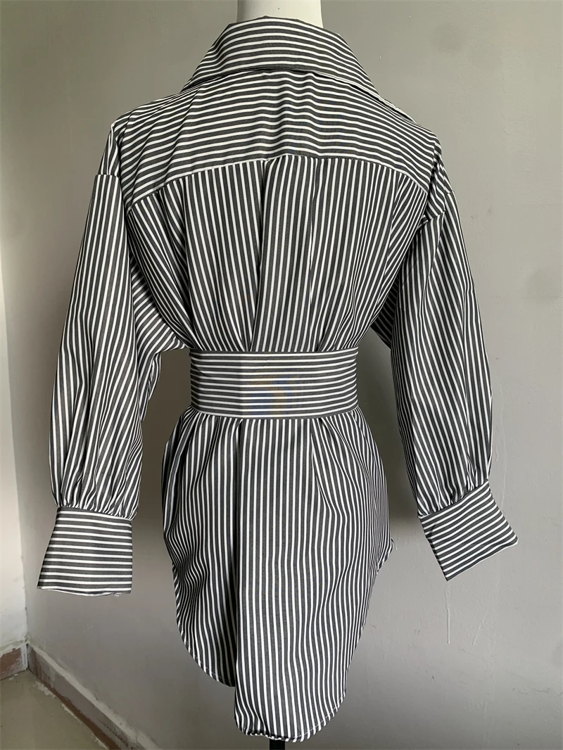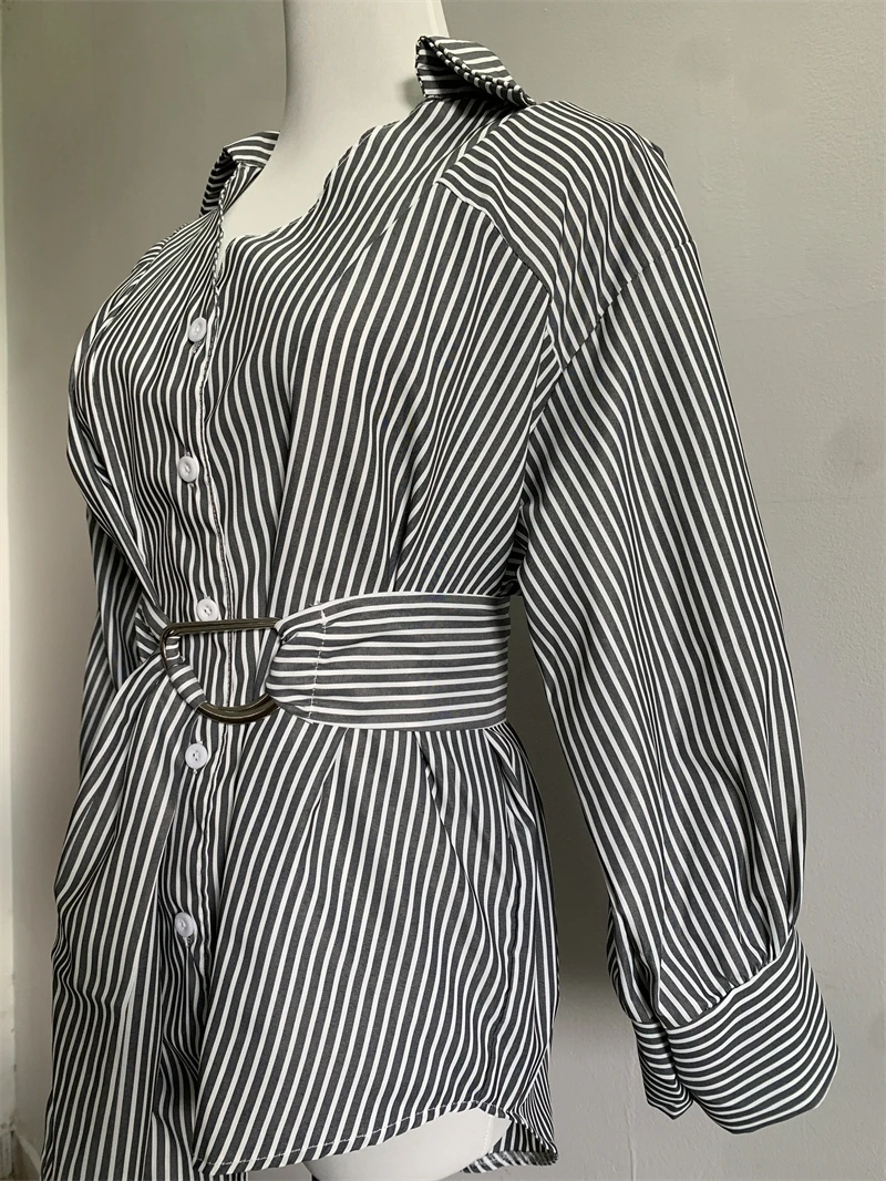 Fleepmart Women Striped Shirt With Belt Casual Tops Autumn Long Sleeve Turn-down Collar Button-up Loose Blouse Casual Oversize Streetwear
