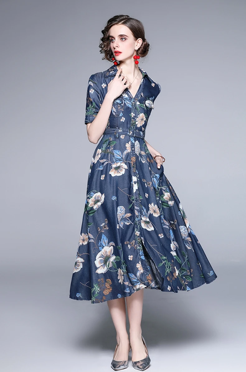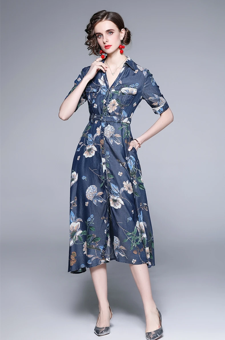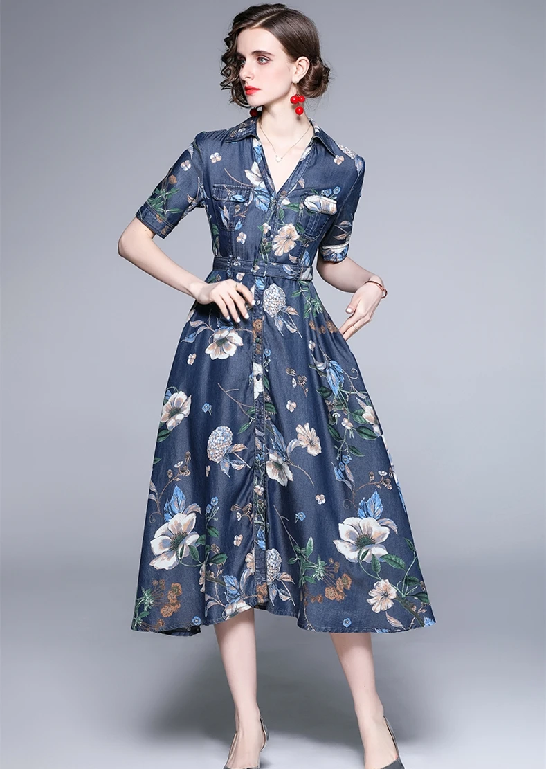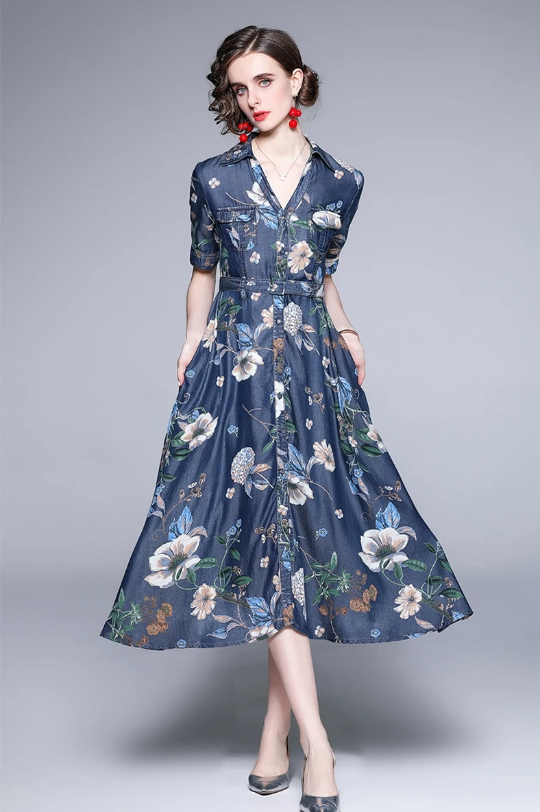 Fleepmart Women Summer Elegant Denim Dress Shirt High Quality Long Floral Party Robe Femme Vintage Designer A-Line Vestidos