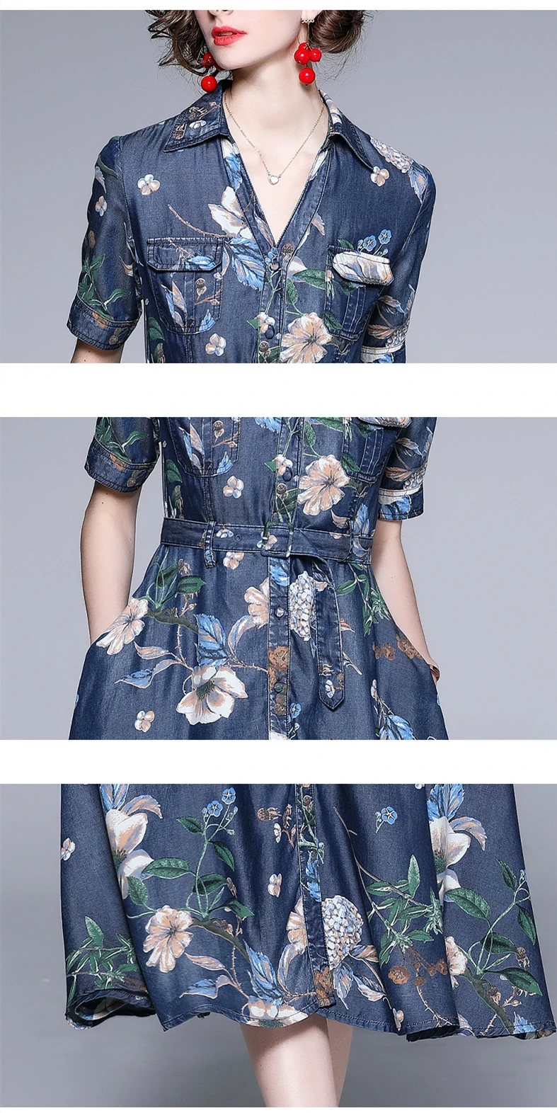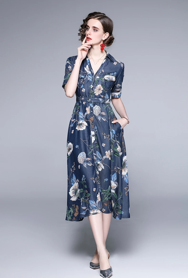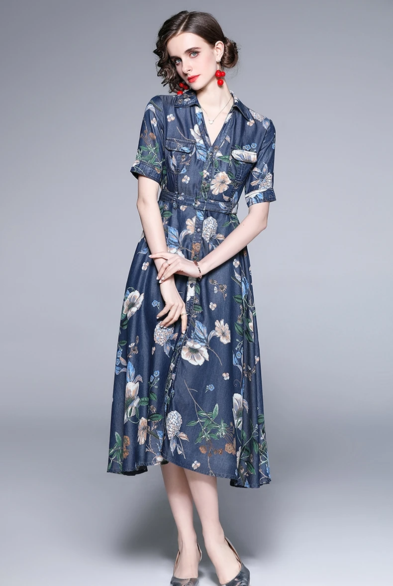 Fleepmart Women Summer Elegant Denim Dress Shirt High Quality Long Floral Party Robe Femme Vintage Designer A-Line Vestidos