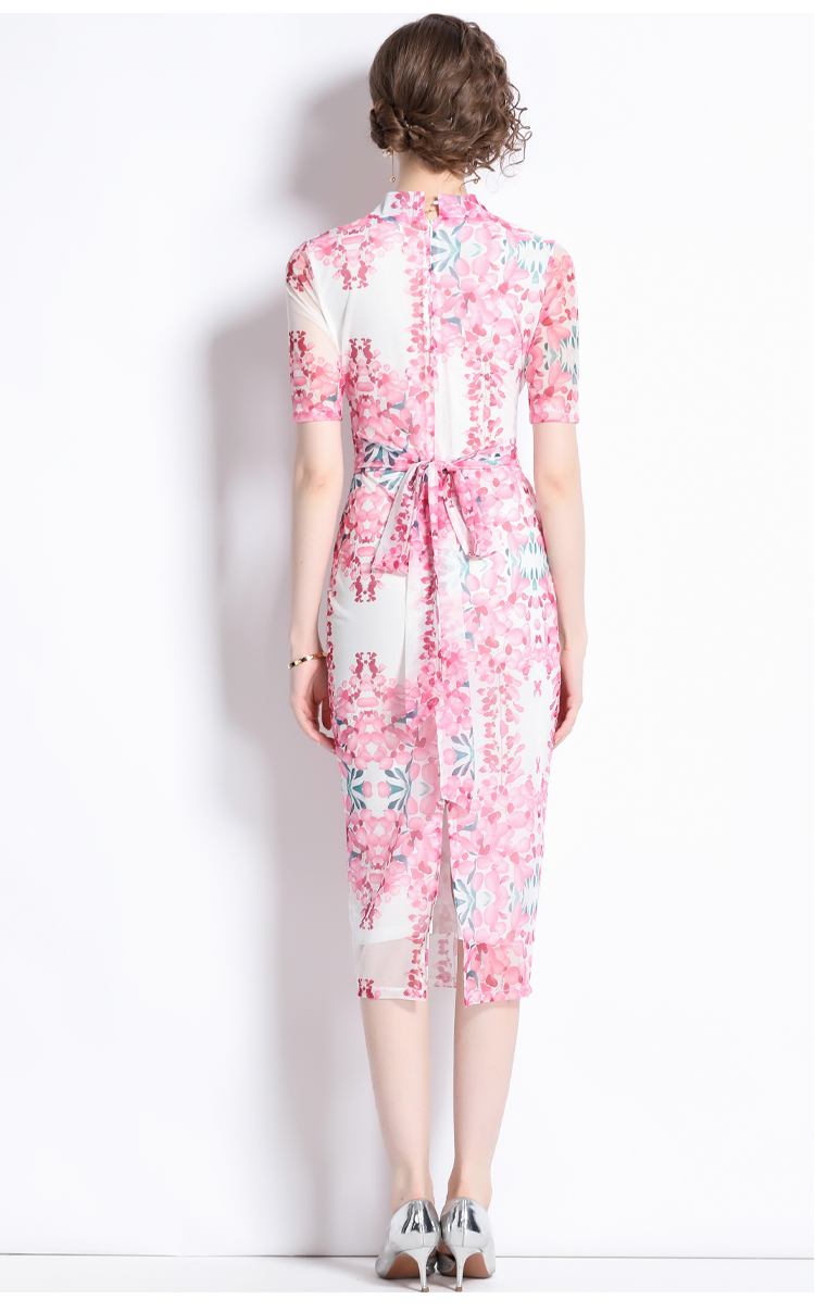 Fleepmart Women Summer Pink Elegant Mesh Dress High Quality Floral Cocktail Party Robe Vintage V-Neck Designer Pencil Vestidos