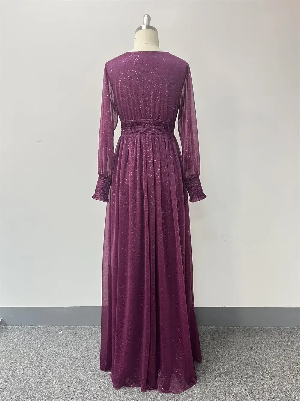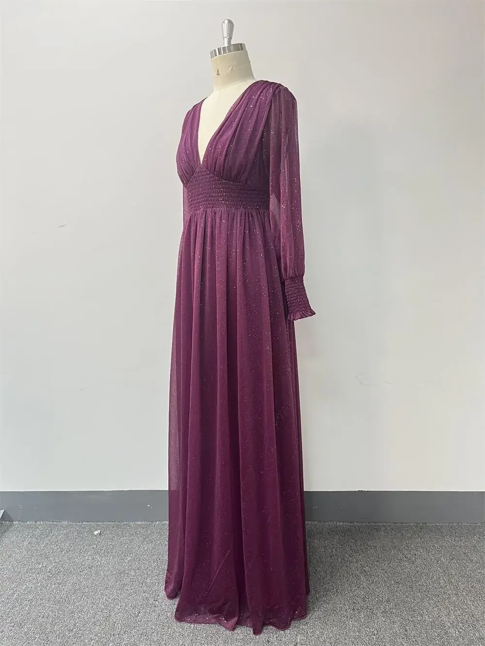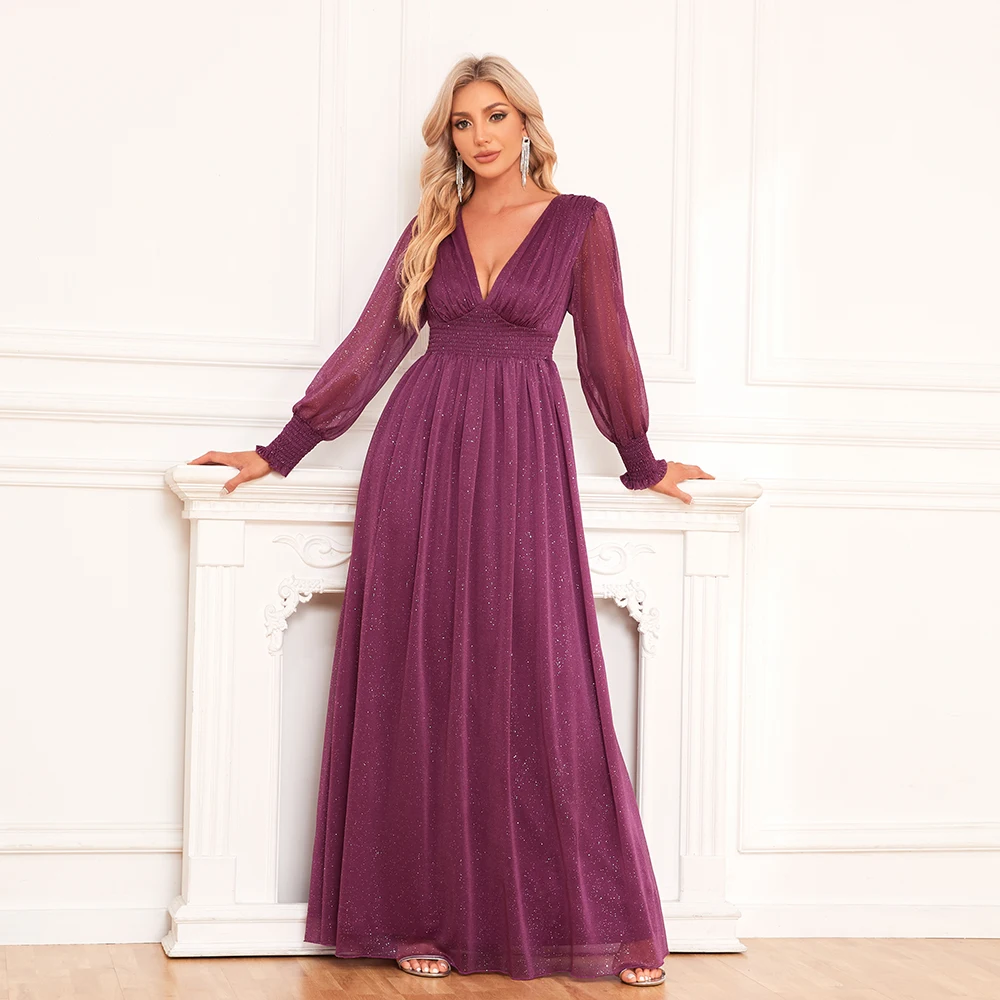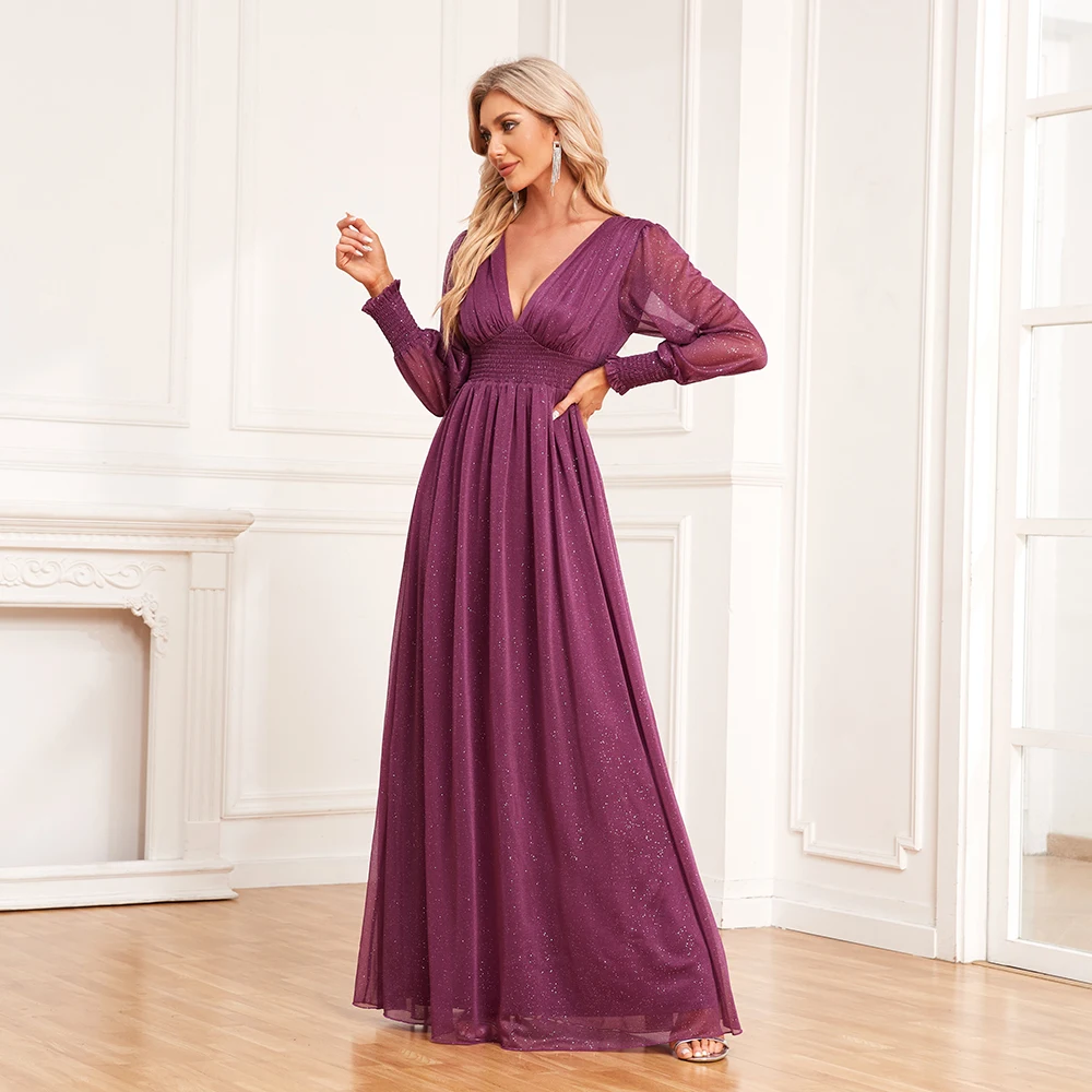 Fleepmart Women V-Neck Shiny Gauze Elasticity Waist Long Evening Dresses Long Sleeve A-Line Birthday Party Dress New