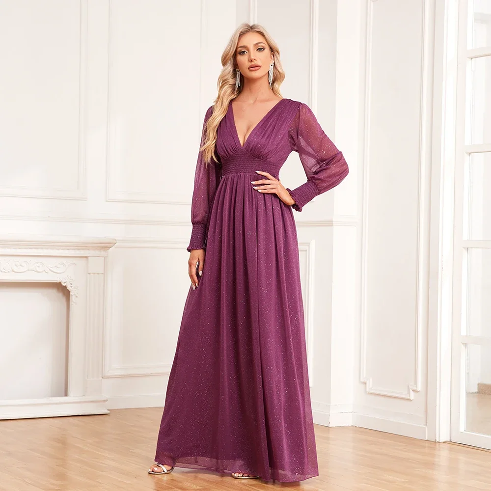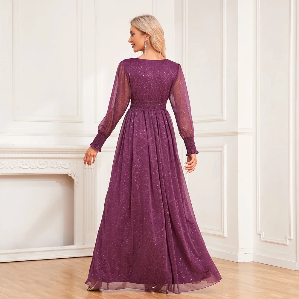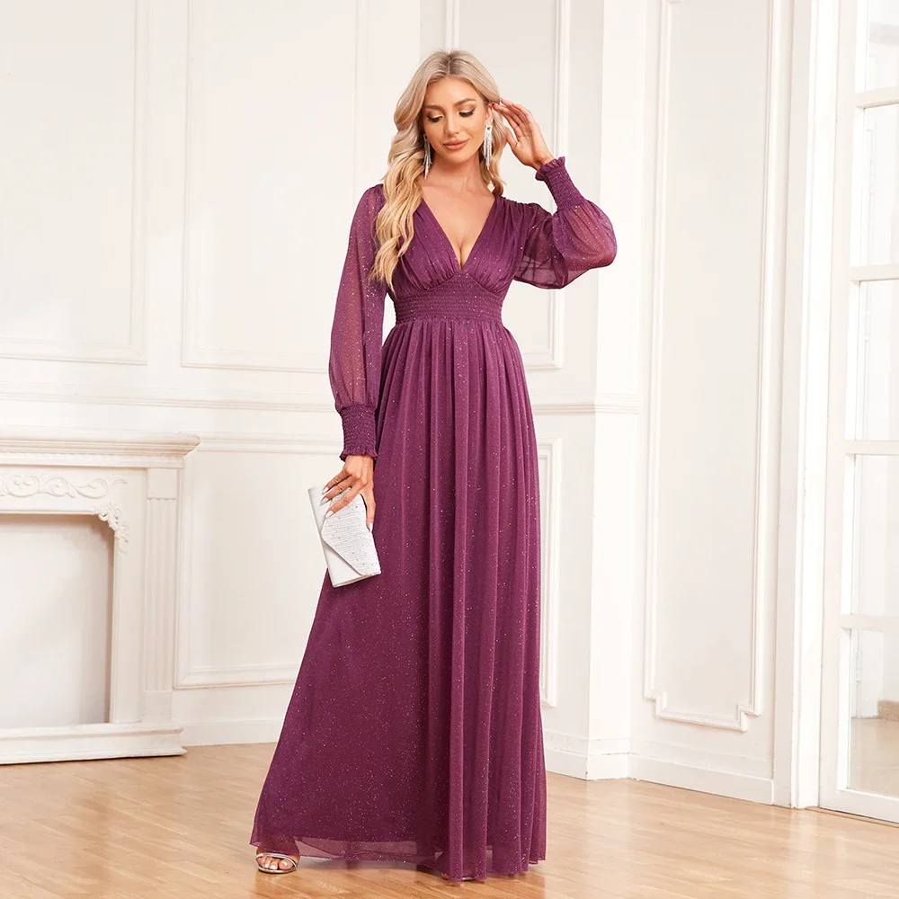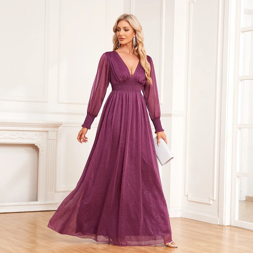 Fleepmart Women V-Neck Shiny Gauze Elasticity Waist Long Evening Dresses Long Sleeve A-Line Birthday Party Dress New