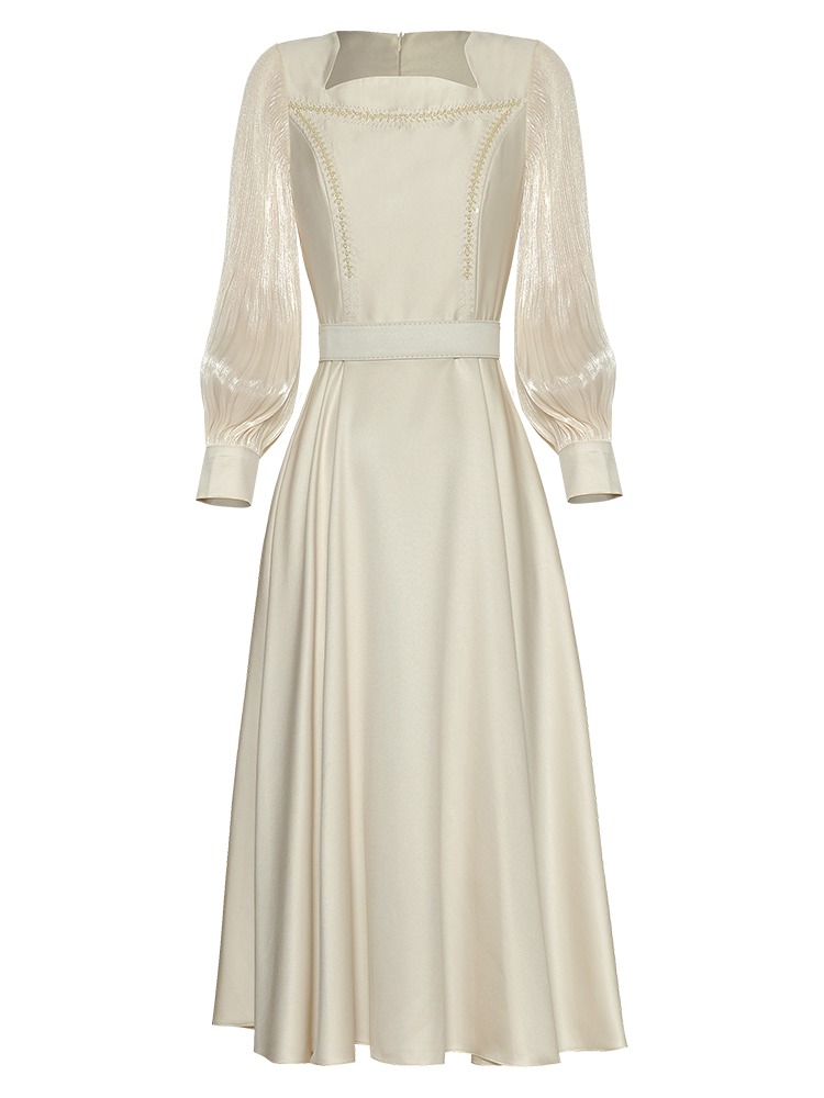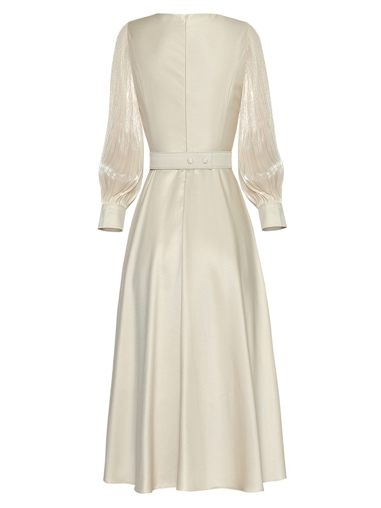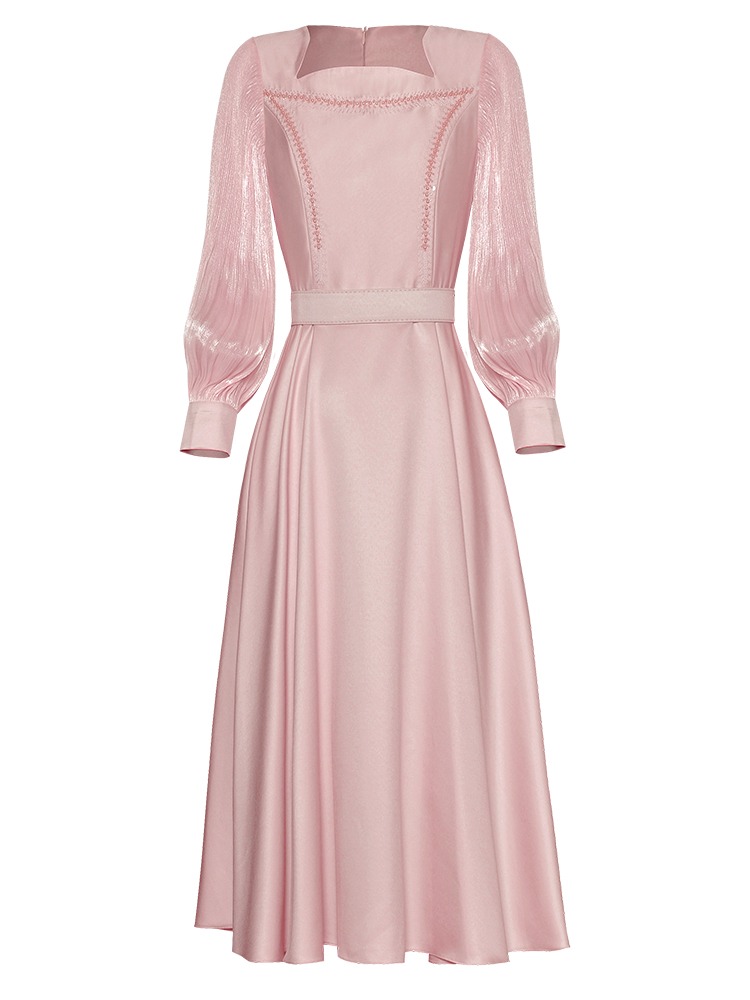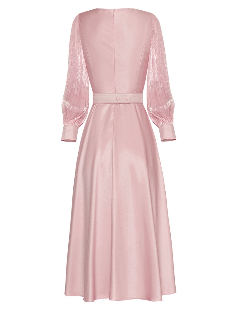 Fleepmart Women’s Catwalk Luxury Spring High Quality Fashion Party Beige Pink Beading Gorgeous Sweet Pretty Chic Lace Up Casual Midi Dress