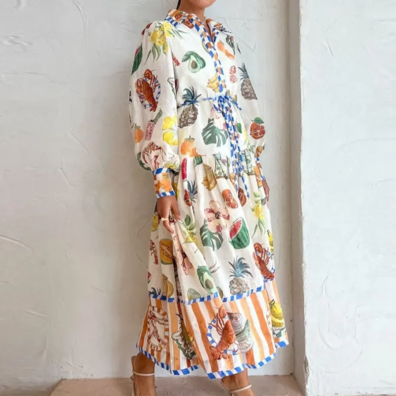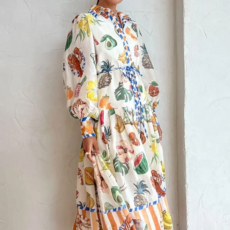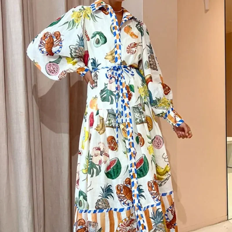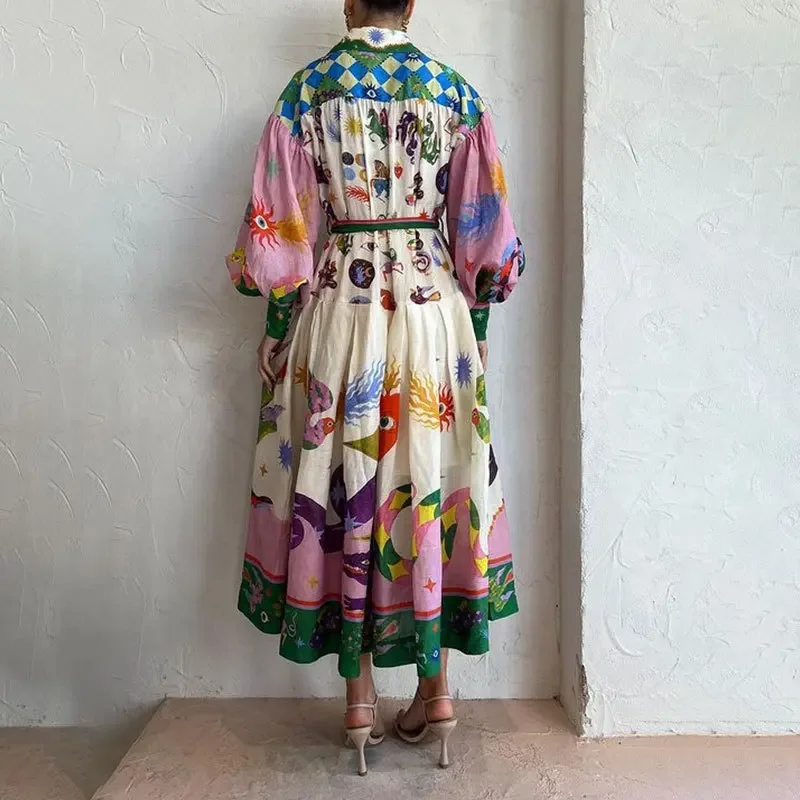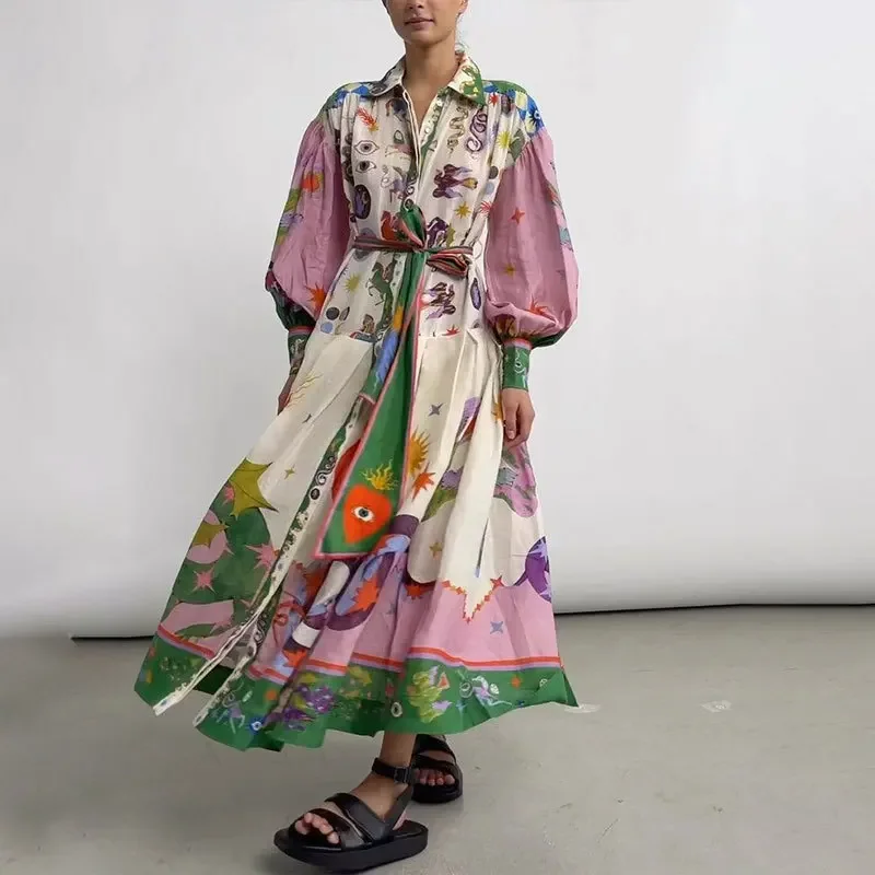 Fleepmart Women’s Dress Elegant Lantern Sleeve Printing Long Waist-fitted Long Sleeve Dress Fashionable Outerwear