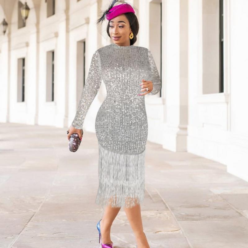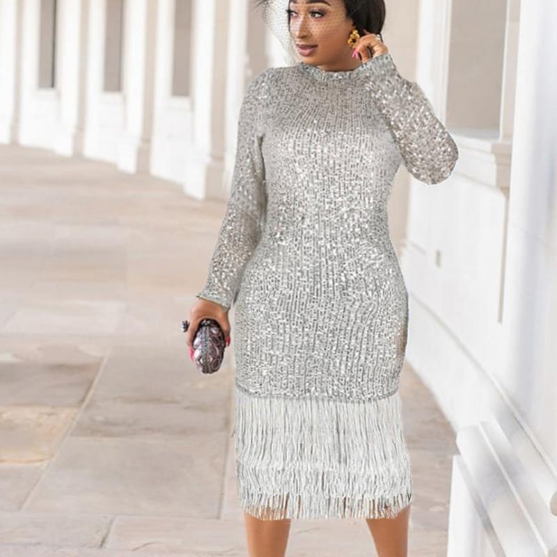 Fleepmart Women’s Midi Dresses High Elastic Sequins Tassel Club Party Fashion Long Sleeve Elegant Sexy Cut-Out Dress Spring