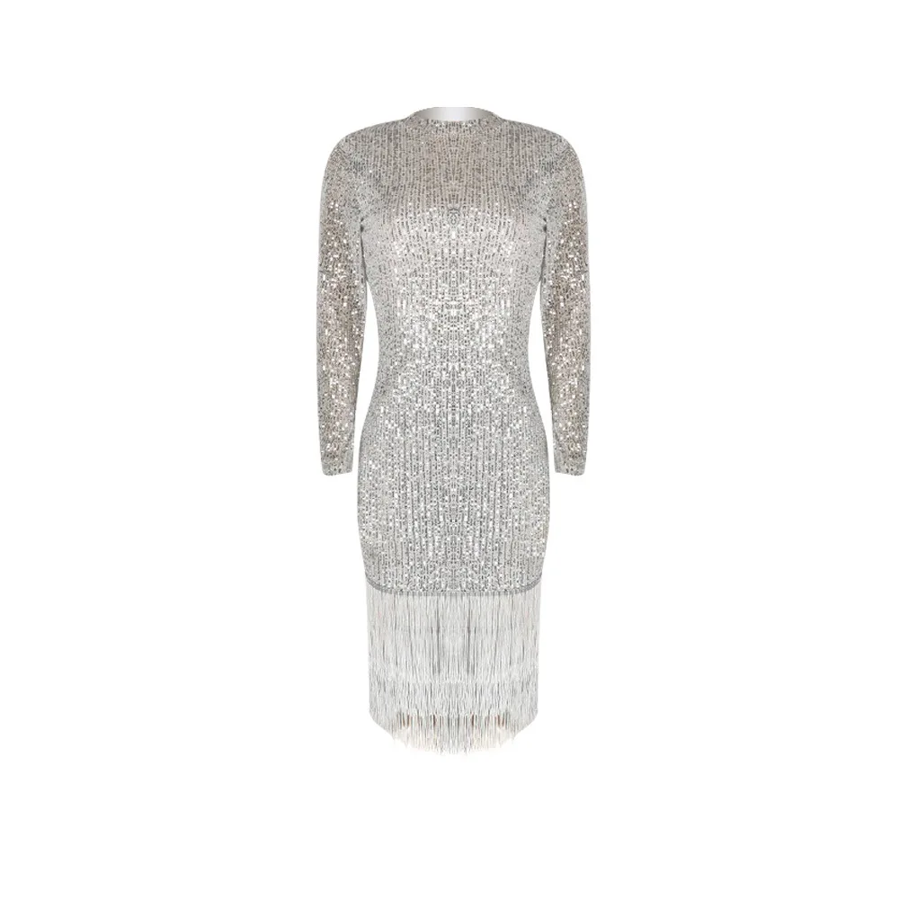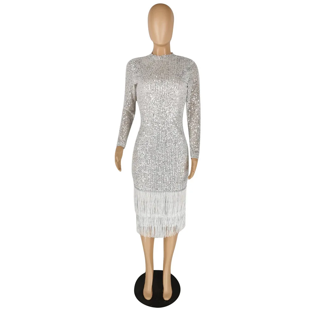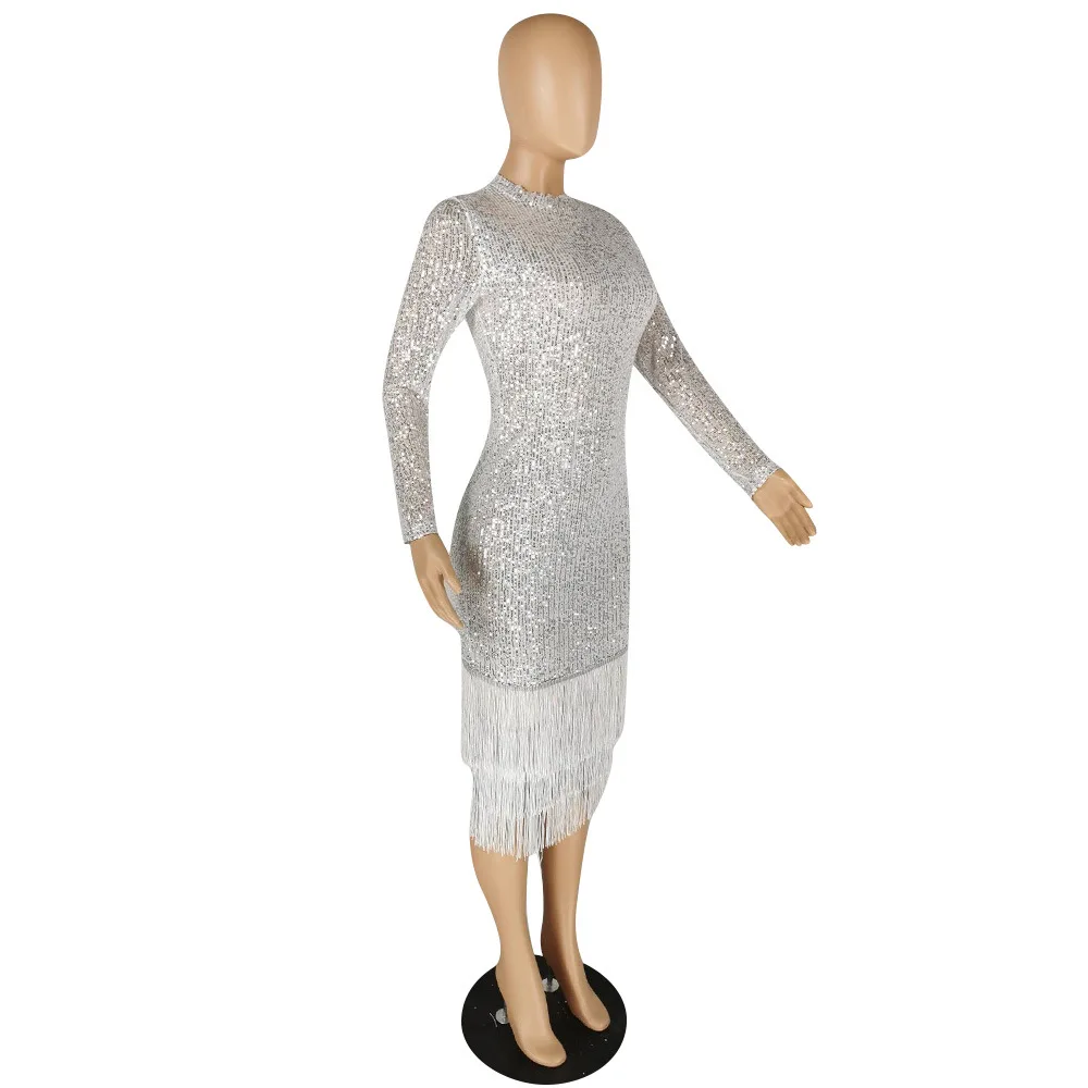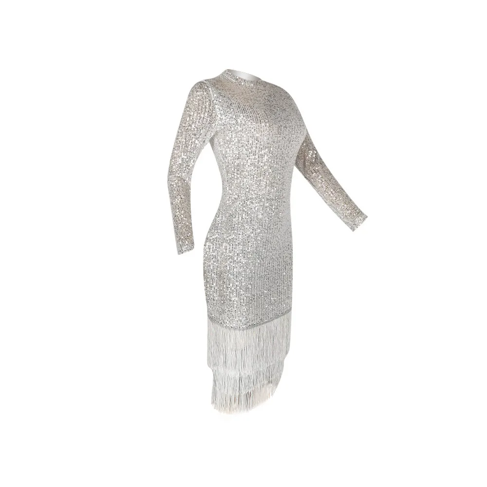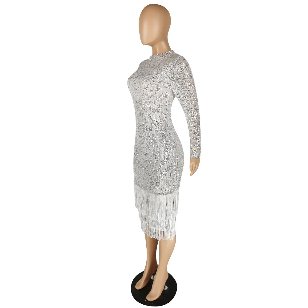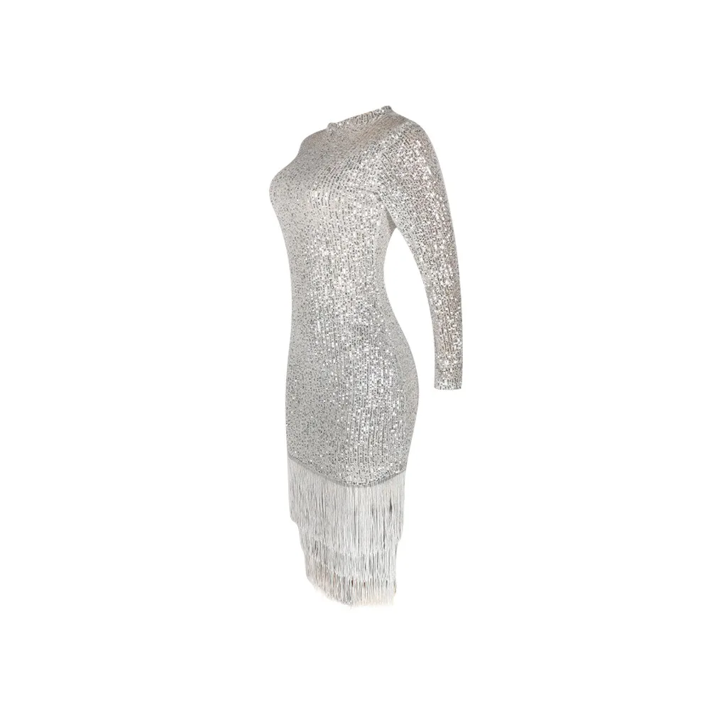 Fleepmart Women’s Midi Dresses High Elastic Sequins Tassel Club Party Fashion Long Sleeve Elegant Sexy Cut-Out Dress Spring