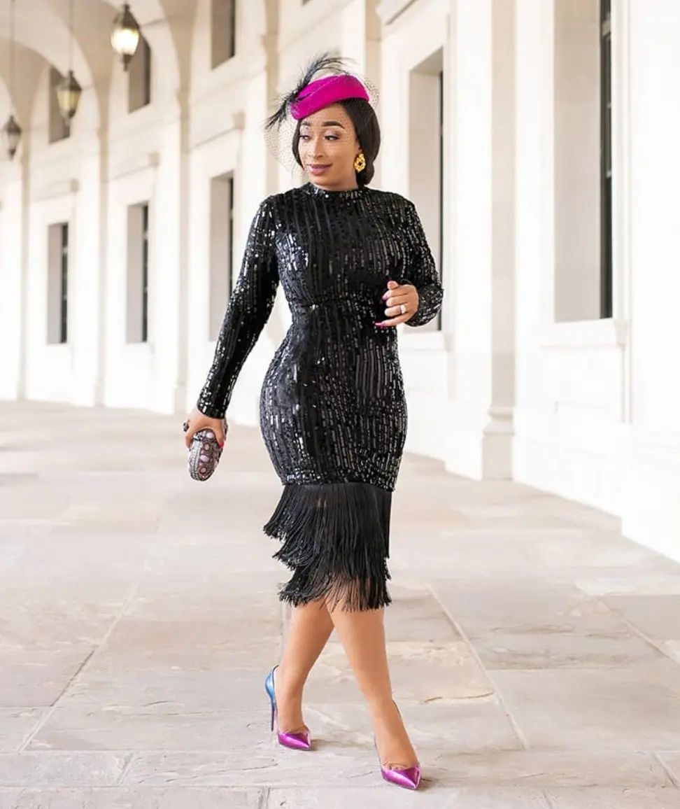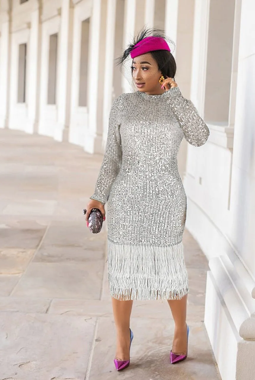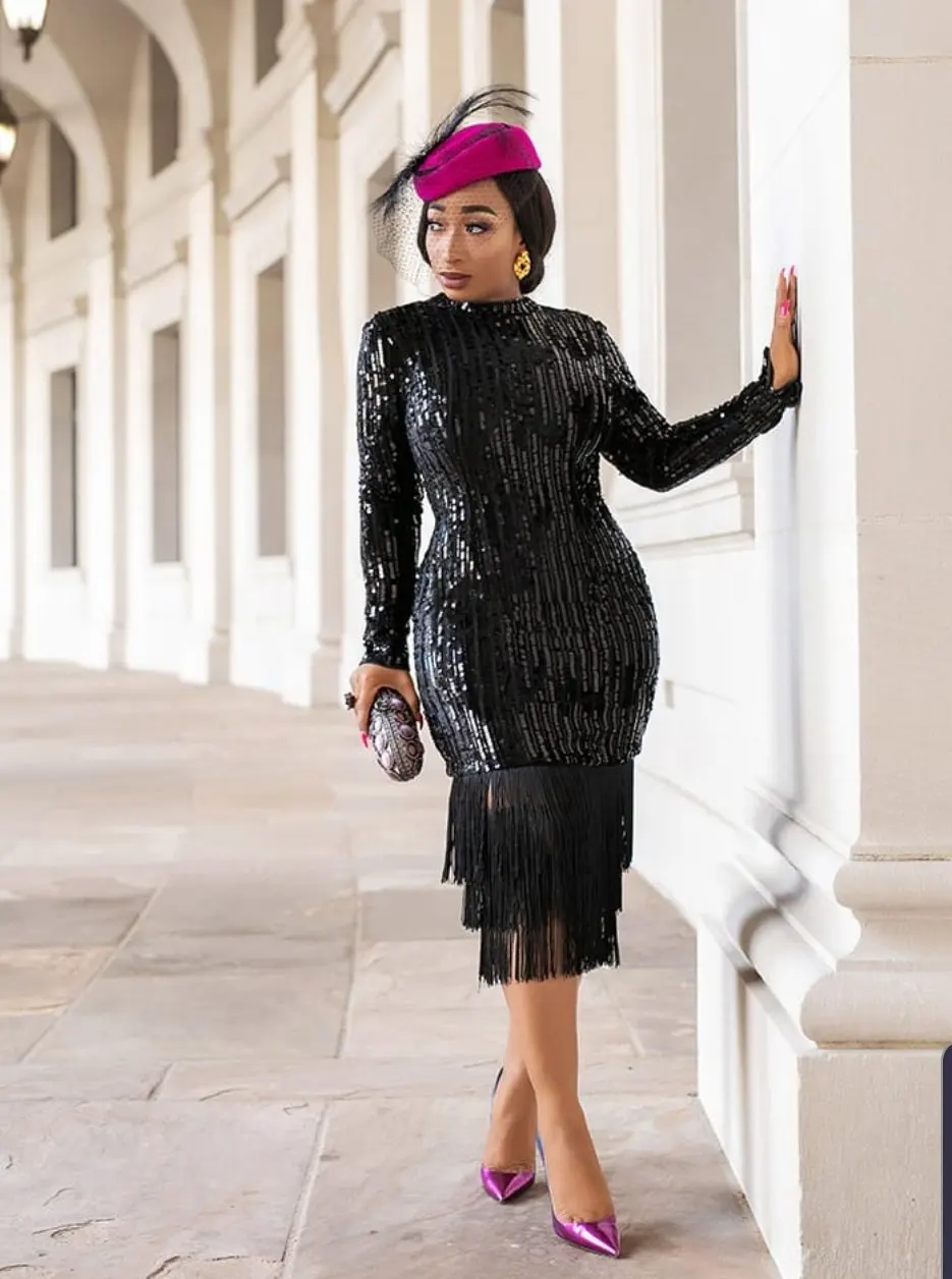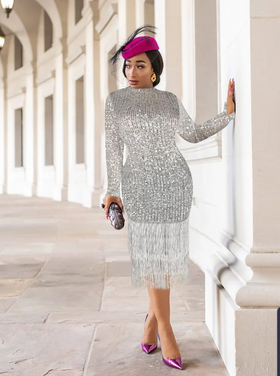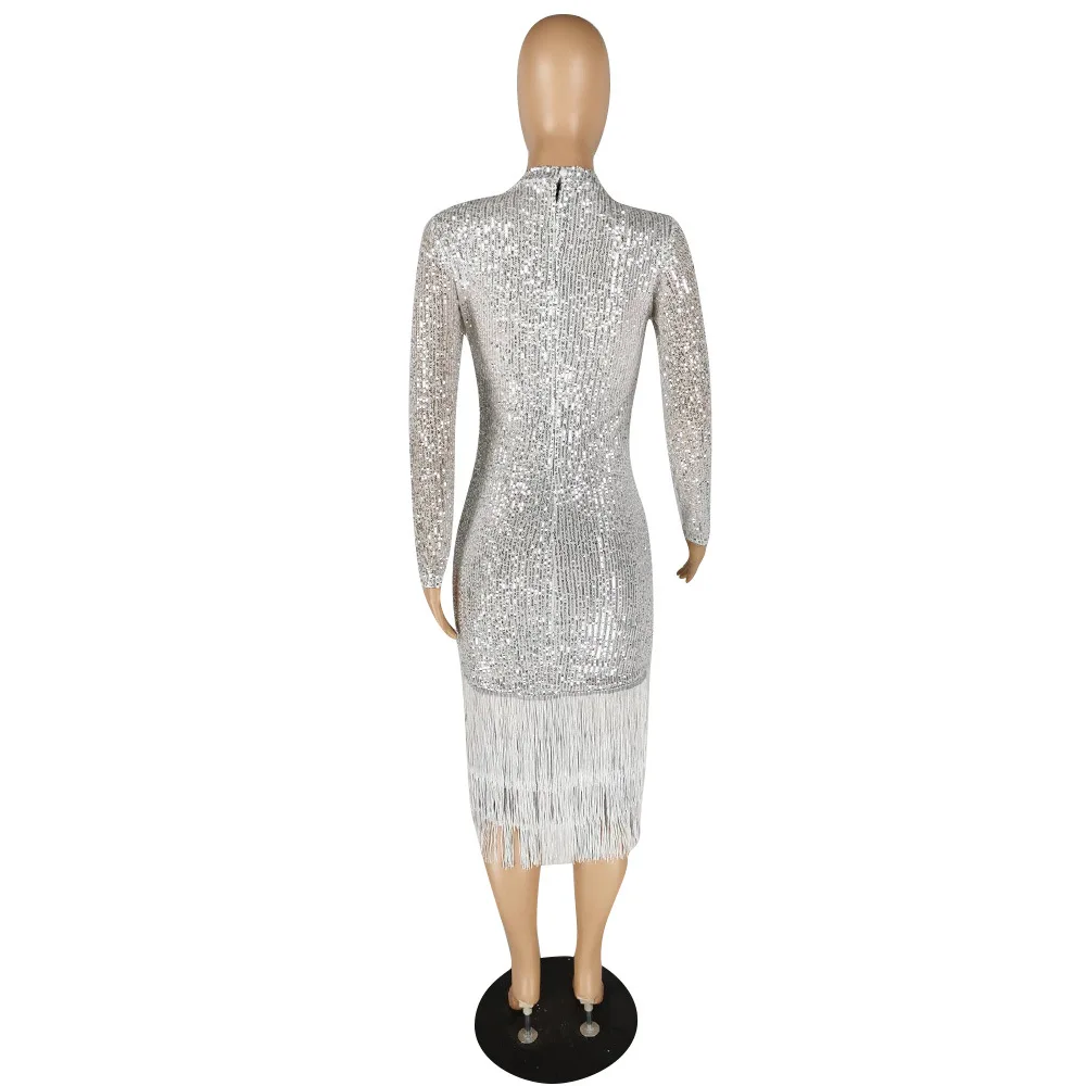 Fleepmart Women’s Midi Dresses High Elastic Sequins Tassel Club Party Fashion Long Sleeve Elegant Sexy Cut-Out Dress Spring