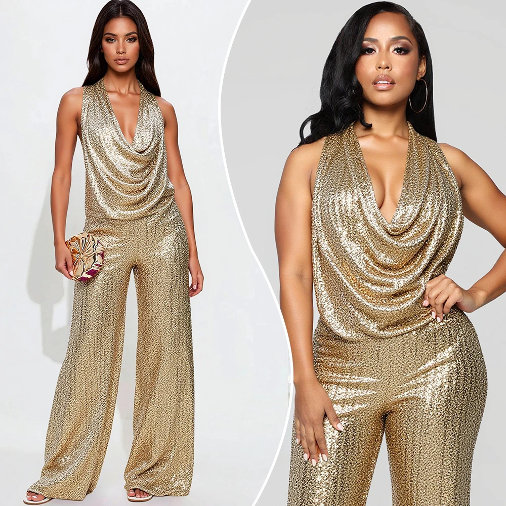 Fleepmart Women’s New 2025 Summer Cross-Border Jumpsuit Sleeveless Halter Neck Sequins Jumpsuit