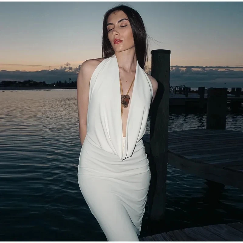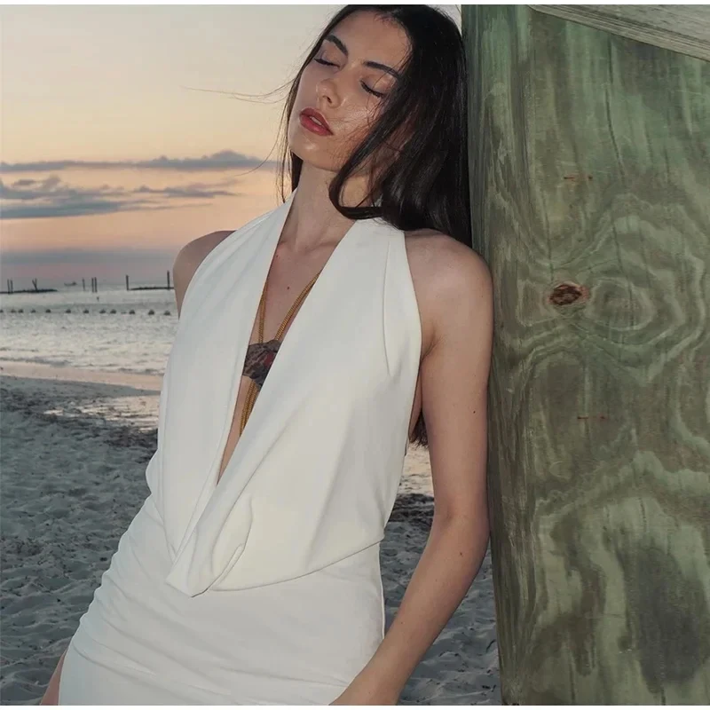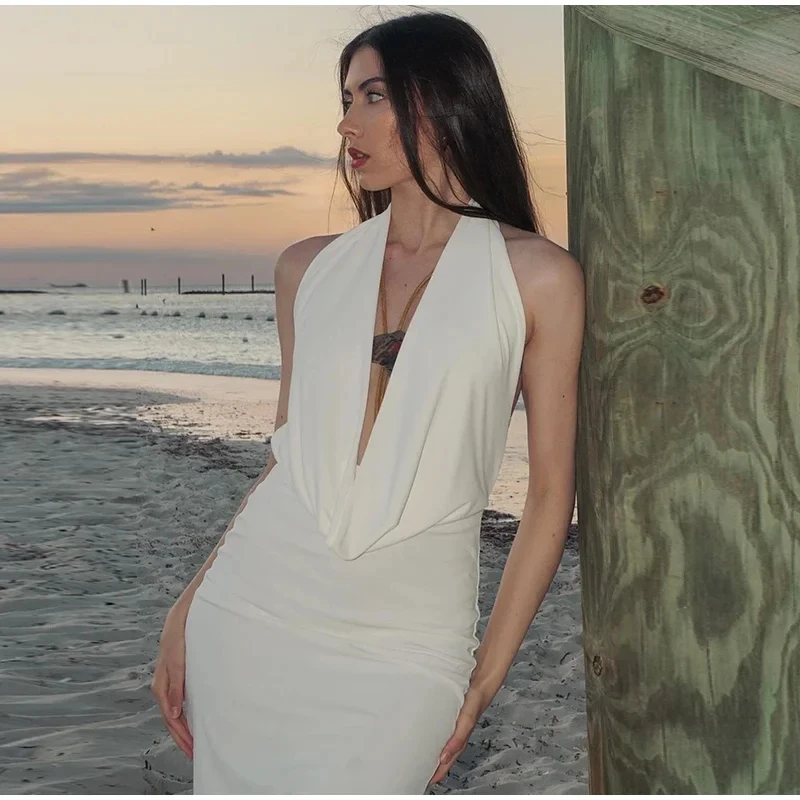 Fleepmart Women’s Pleated Neck Hanging Backless Deep V-shaped Slim Fit Summer New Dress