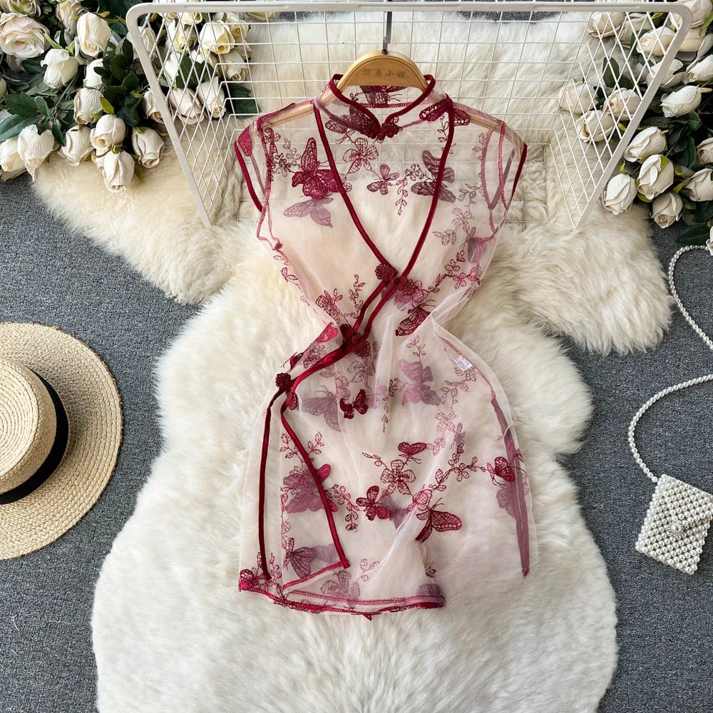 Fleepmart Women’s Sexy Slim Hollow Out Butterfly Embroidery Lace Split Dress Suit Mesh Sheer Traditional Embroidered Stripe Cheongsam Set