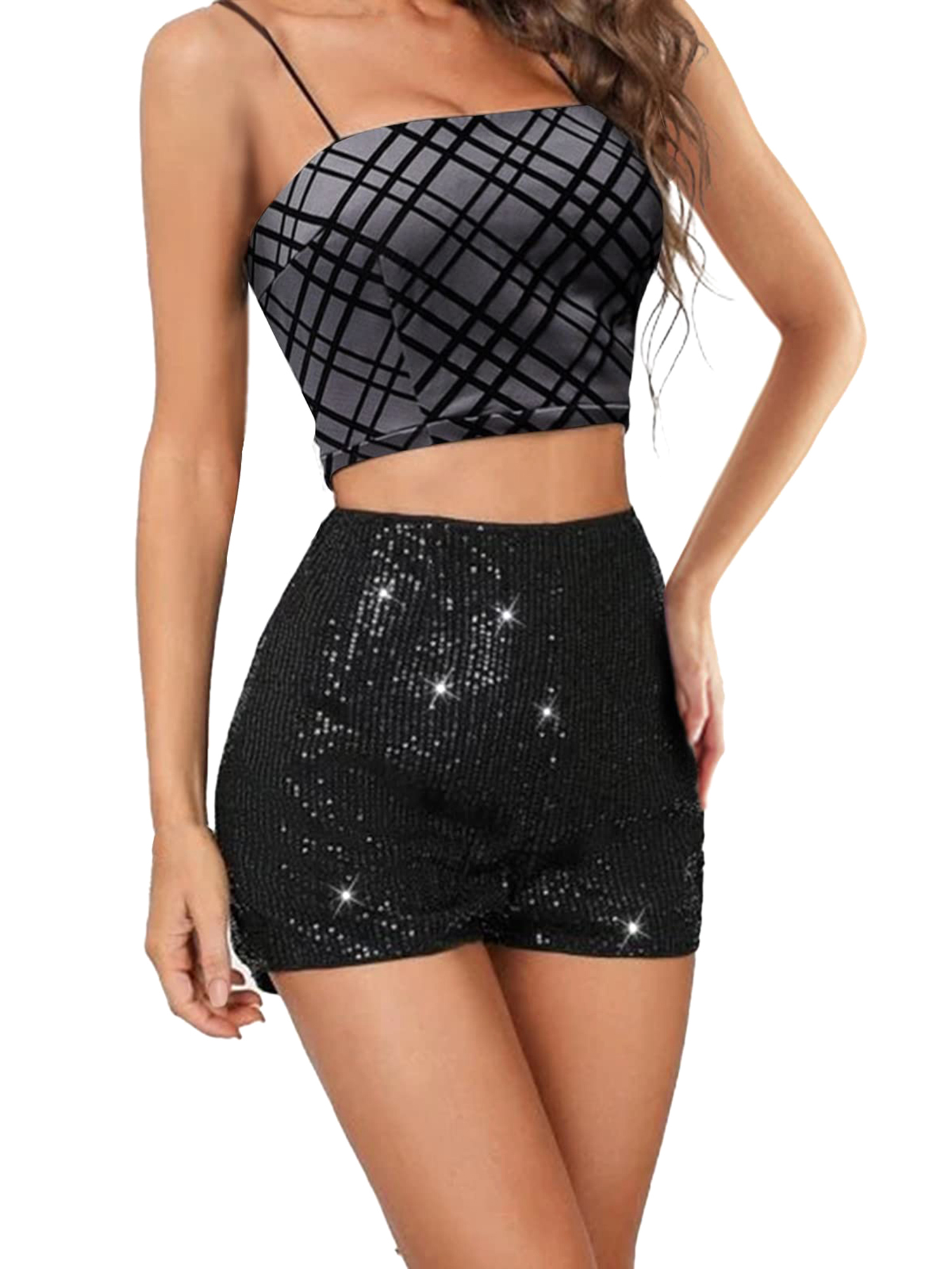 Fleepmart Women’s Shimmering Sequin Mid Rise Elastic Waistband Straight Leg Shorts Vintage Glitter Hot Pants for Party
