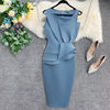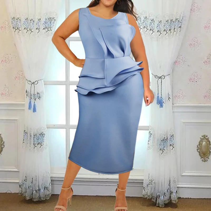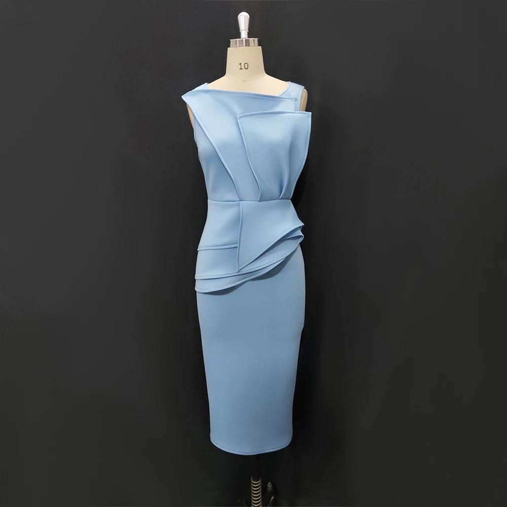 Fleepmart Women’s Sleeveless Skye Blue Summer Bodycon Sundress with Pleat Ruffles Midi Calf Length Round Neck Elegant Party Dresses Robes
