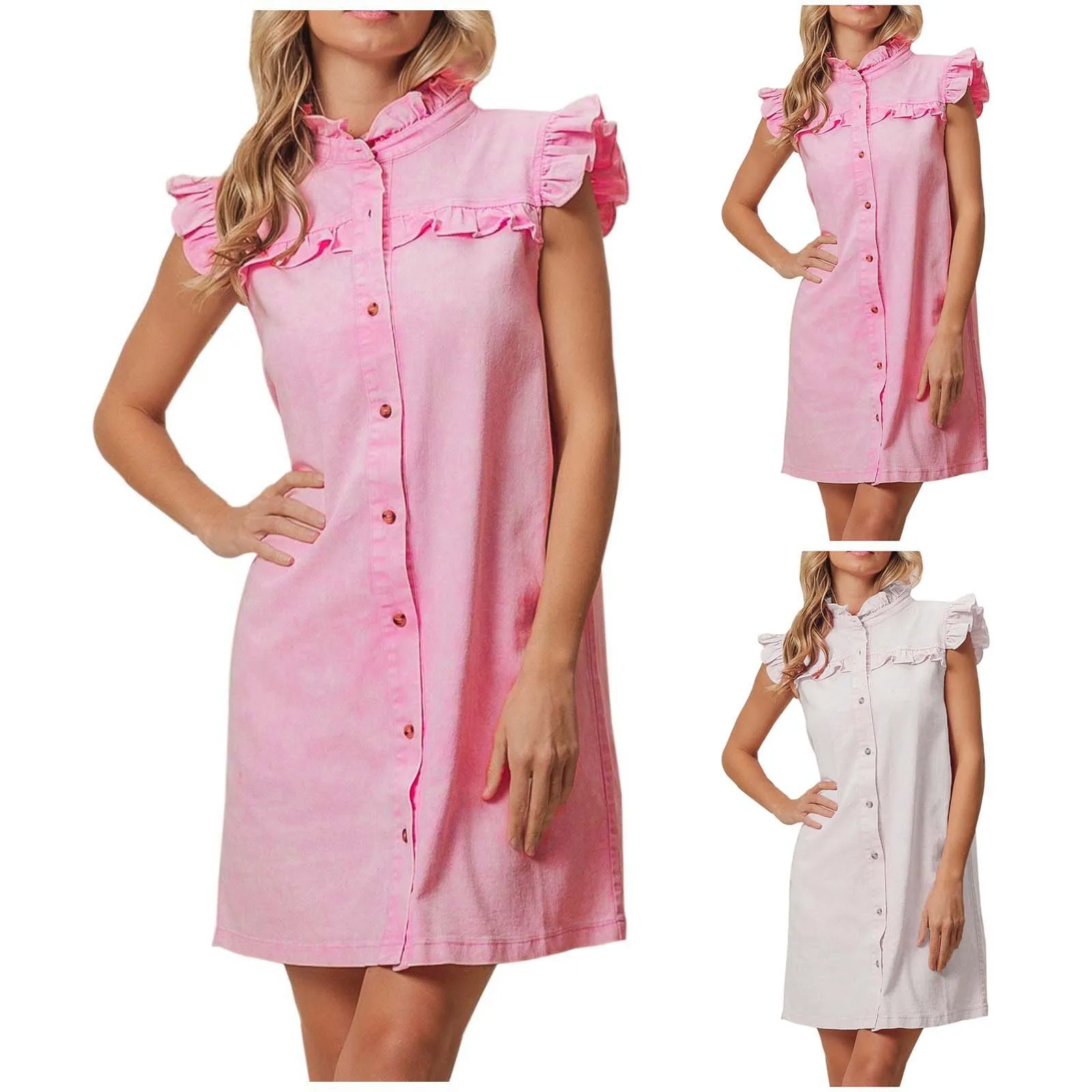 Fleepmart Women’s Summer Denim Shirt Dress 2024 Single-Breasted Ruffles Jean Dresses Vestidos Korean Fashion Solid Color Sundress 원피스