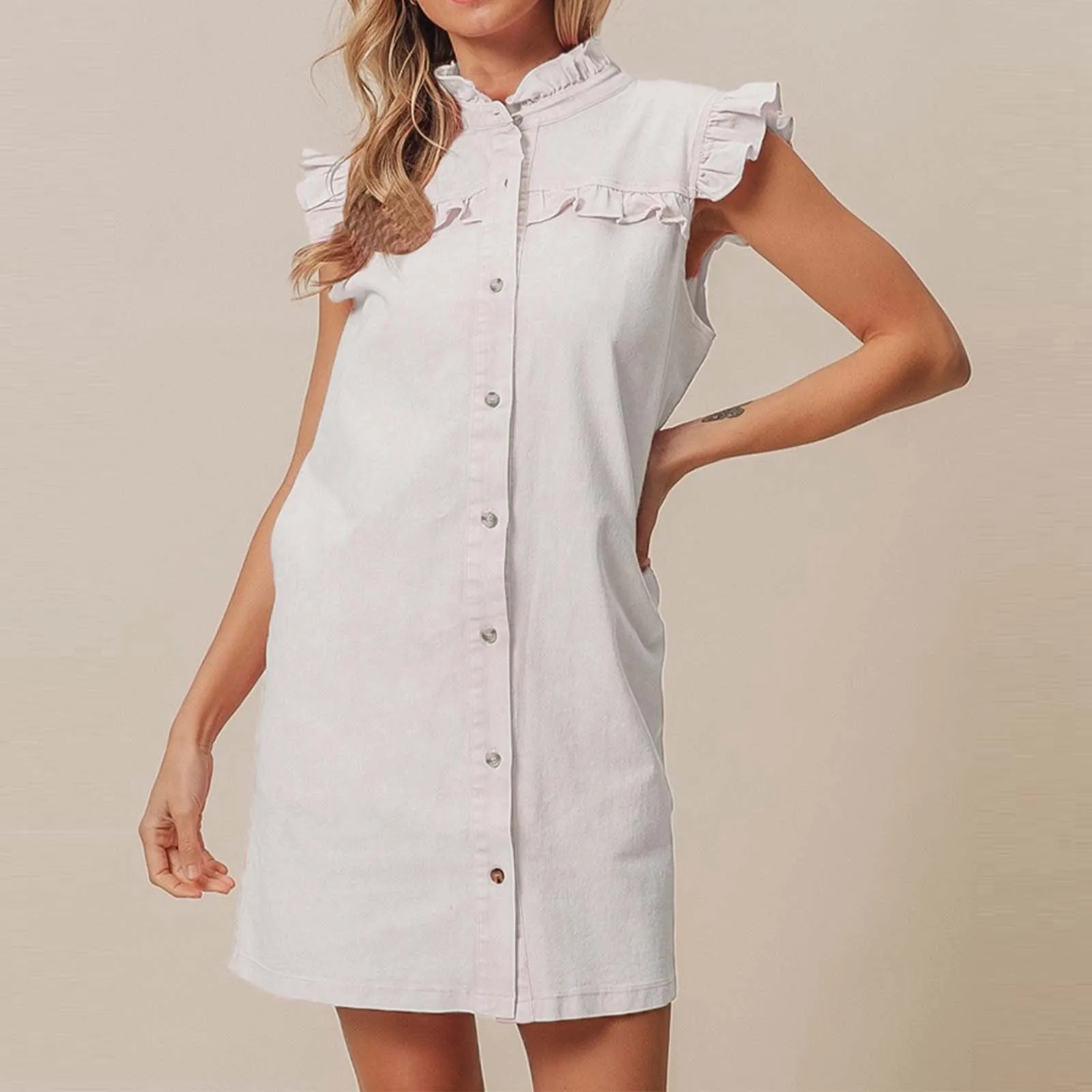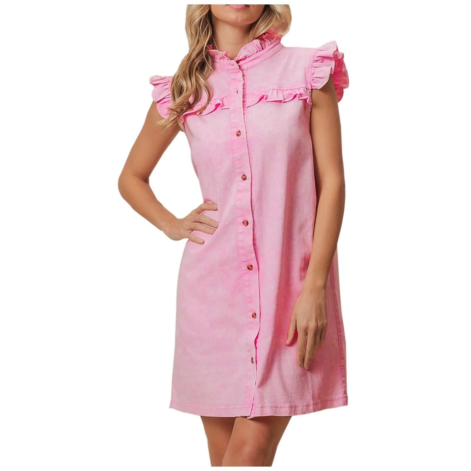 the warmth of summer in our Women’s Lightweight Flutter Sleeve Denim Shirt Dress, a perfect blend of style and comfort. Designed with your relaxation in mind, this dress is crafted from breathable denim, tailored for those balmy days when you desire both fashion and functionality.
