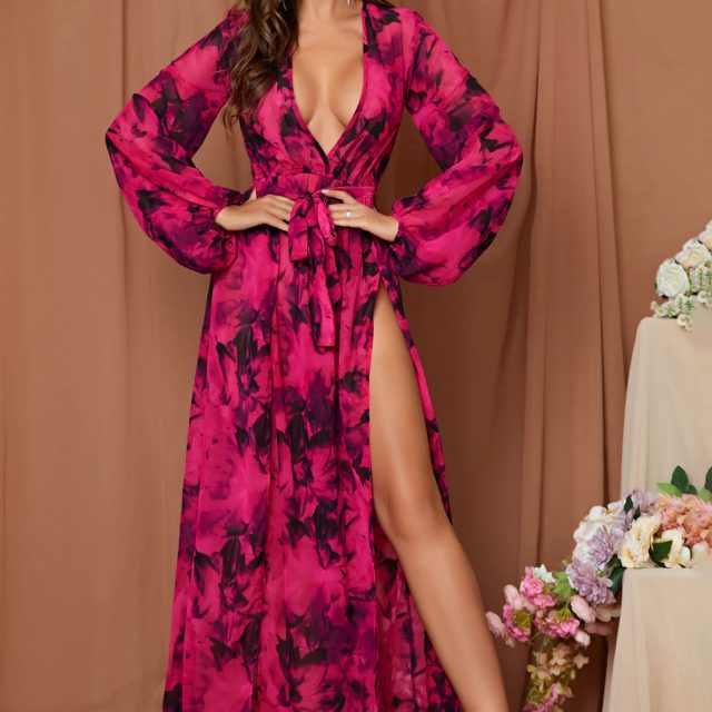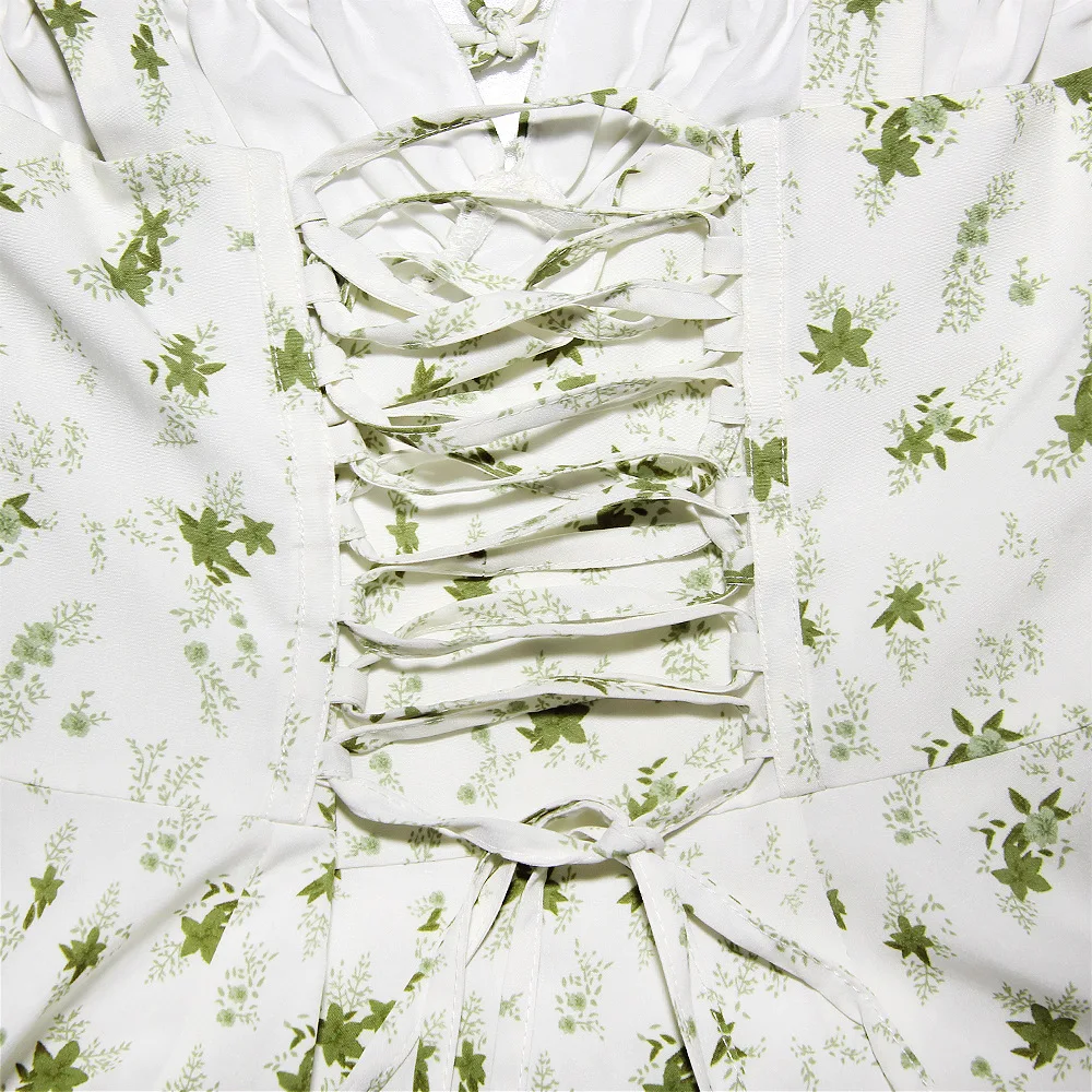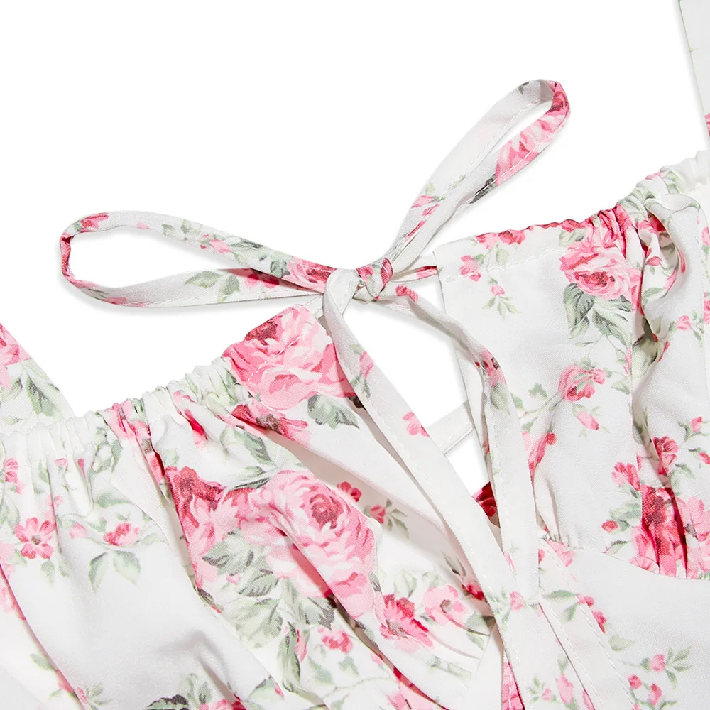 Fleepmart Women’s Summer Floral Print Dresses Sweet Elegant Midi Holiday Dress Casual Slit Blue Lace Up Dresses 2024