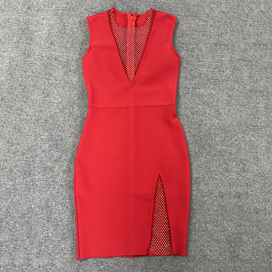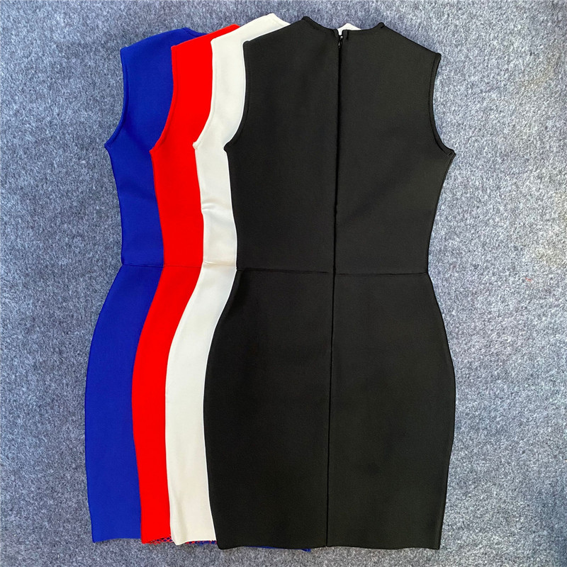 Fleepmart Women’s Summer Sexy O-Neck Mesh Diamond Red Black Mini Elegant Stitching Evening Party Bandage Dress
