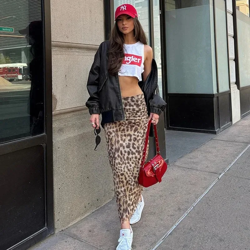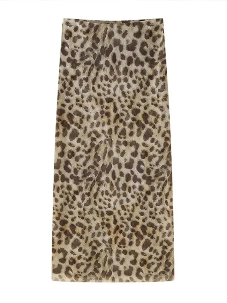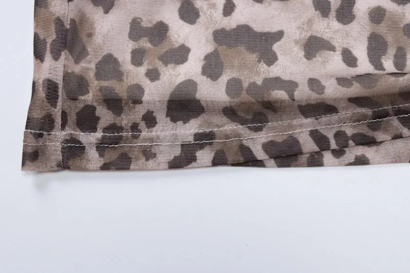 Fleepmart Women’s tulle leopard print top shoulder straight neck and leopard print straight skirt summer casual girls two-piece set