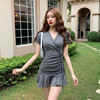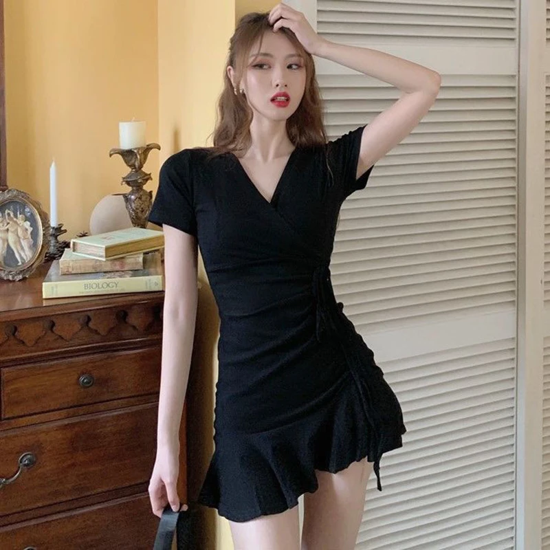 Fleepmart Y2K Summer Women Sexy V Neck Folds Ruffles Trumpet Mini Party Short Sleeve Chic Slim Dress
