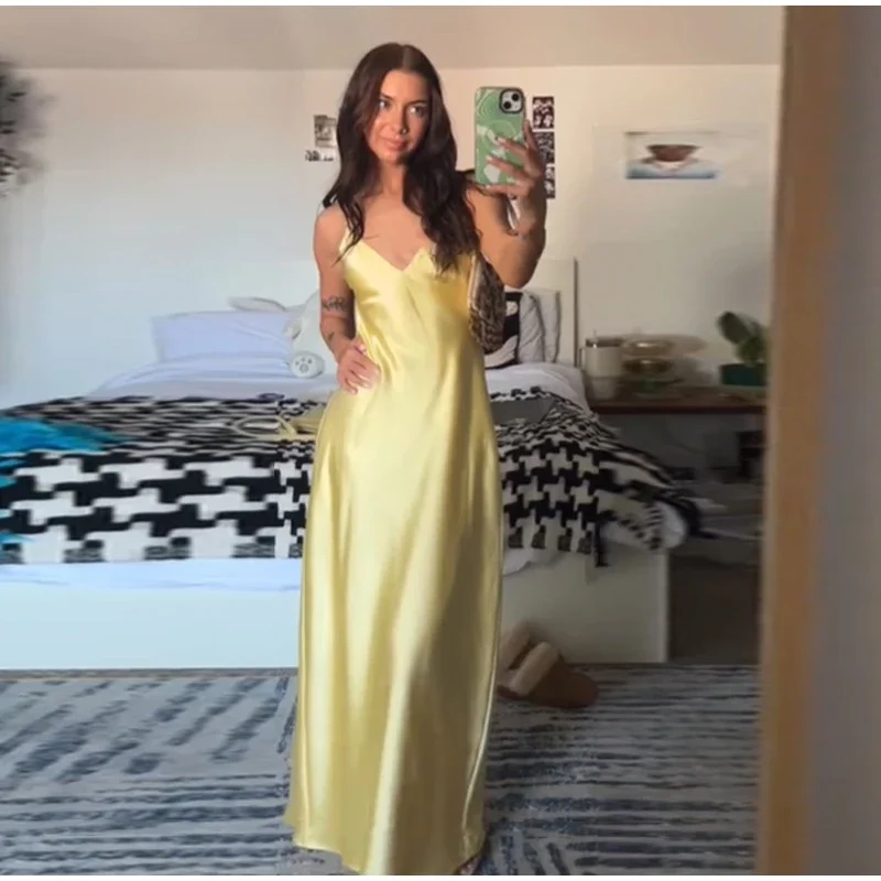 Fleepmart Yellow Elegant Stain Women’s Sling Dress Sexy Backless Sleeveless V Neck High Waist Evening Gown Summer Chic Lady Partywear 2025