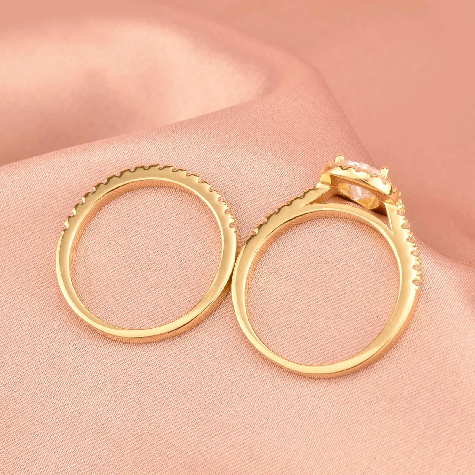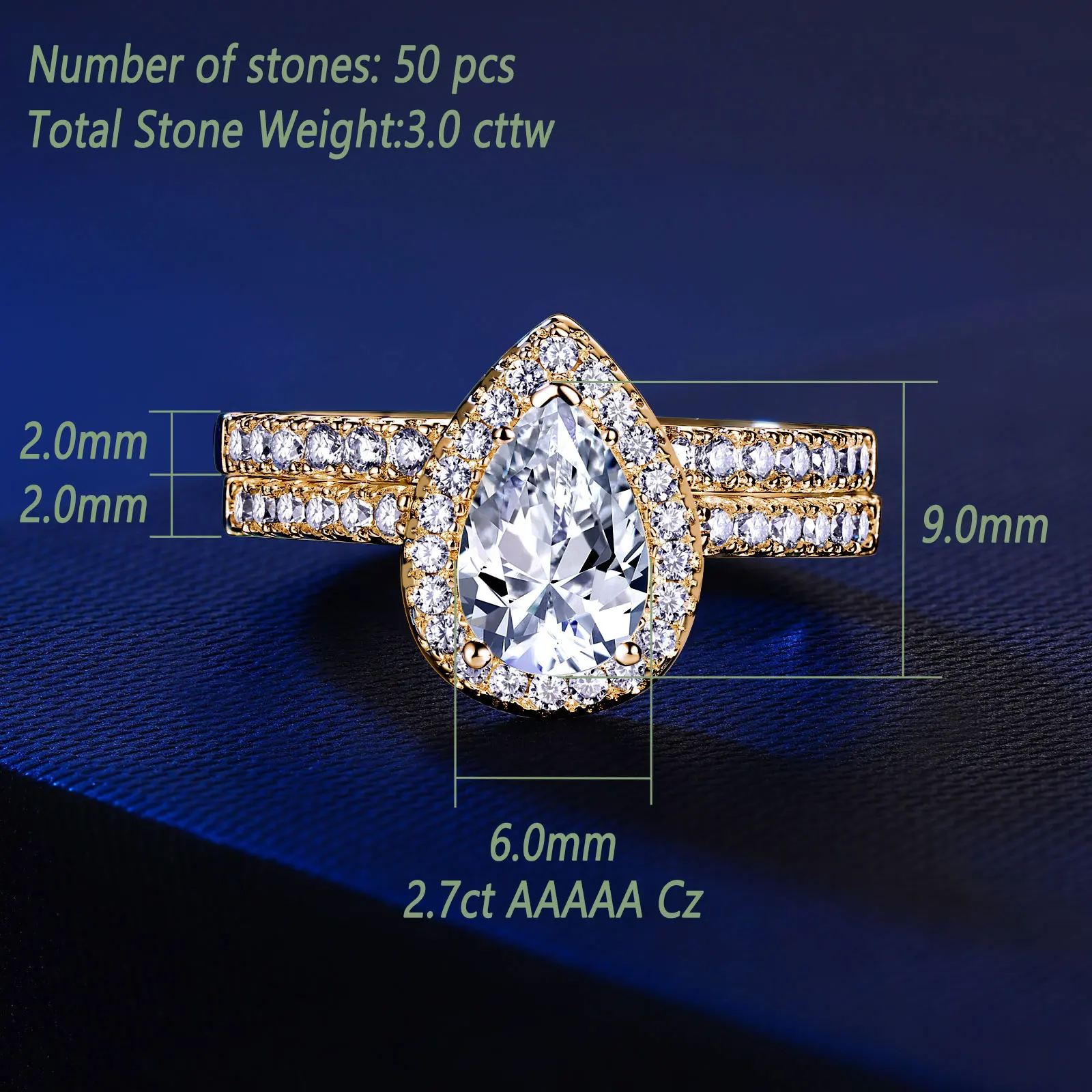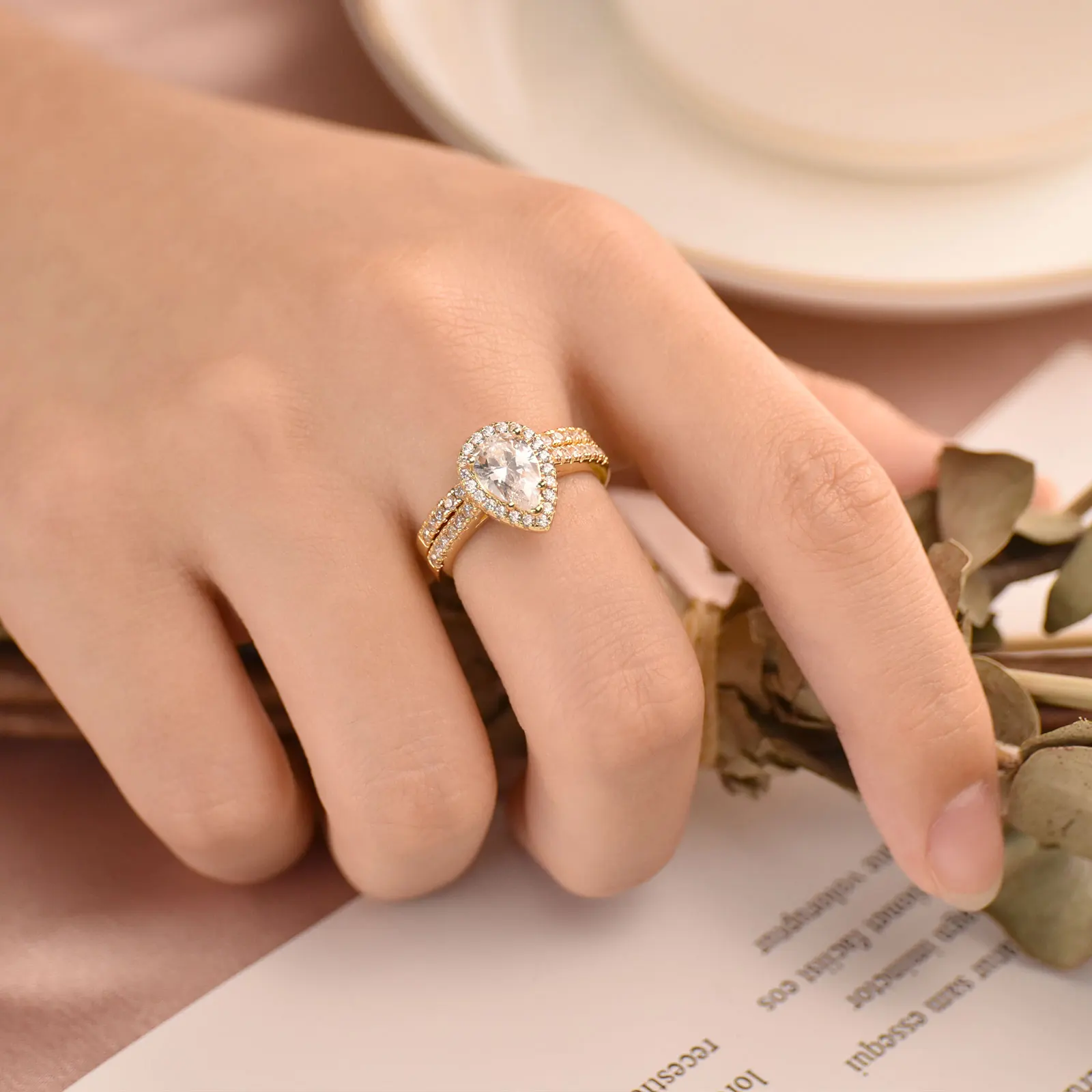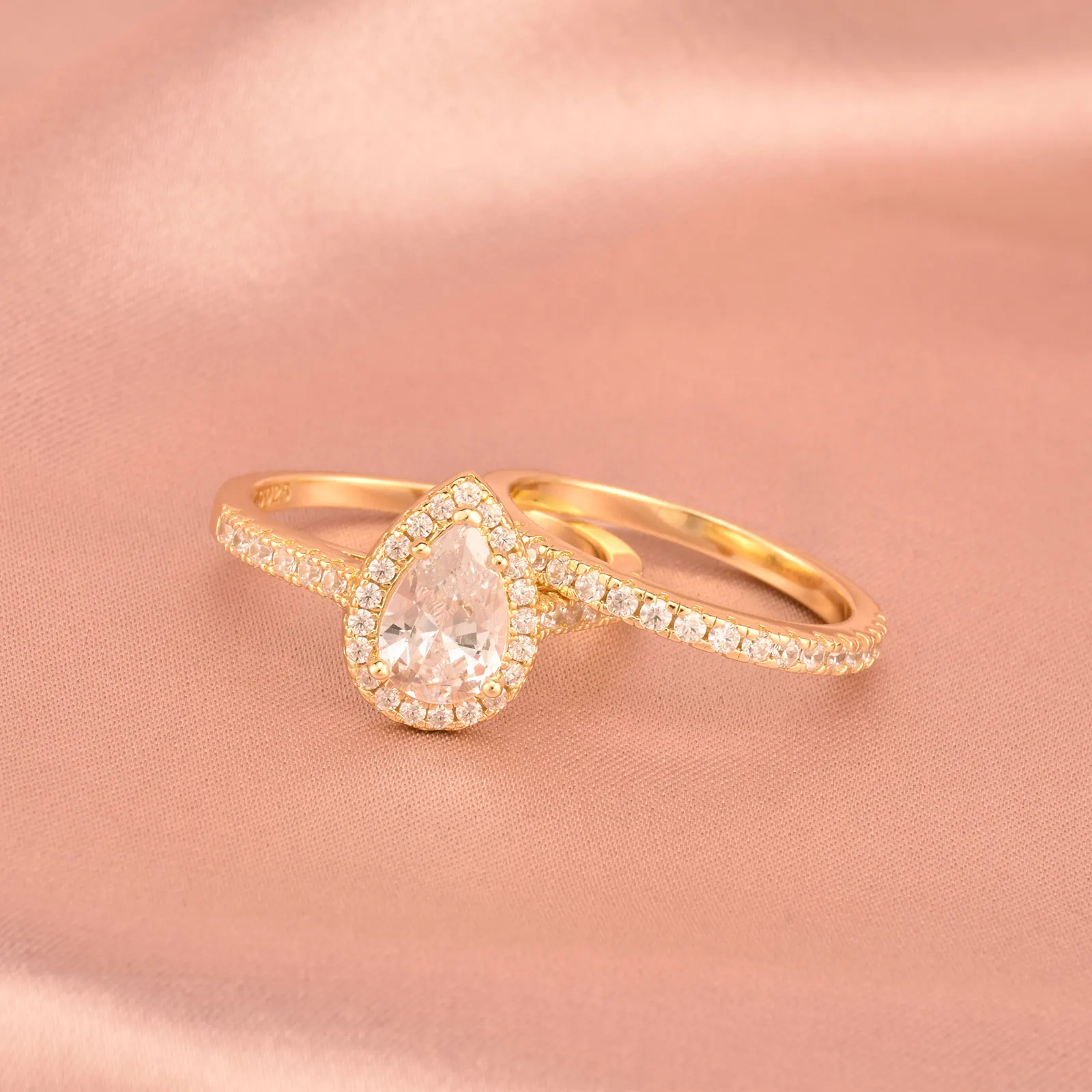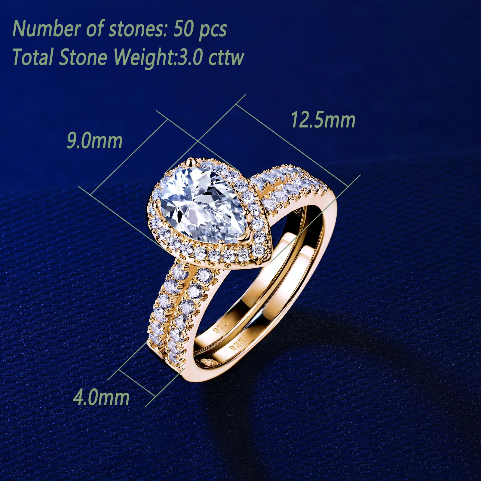 Fleepmart Yellow Gold Bridal Set Solid 925 Sterling Silver Halo AAAAA CZ Pear Cut Engagement Ring Wedding Jewelry For Women