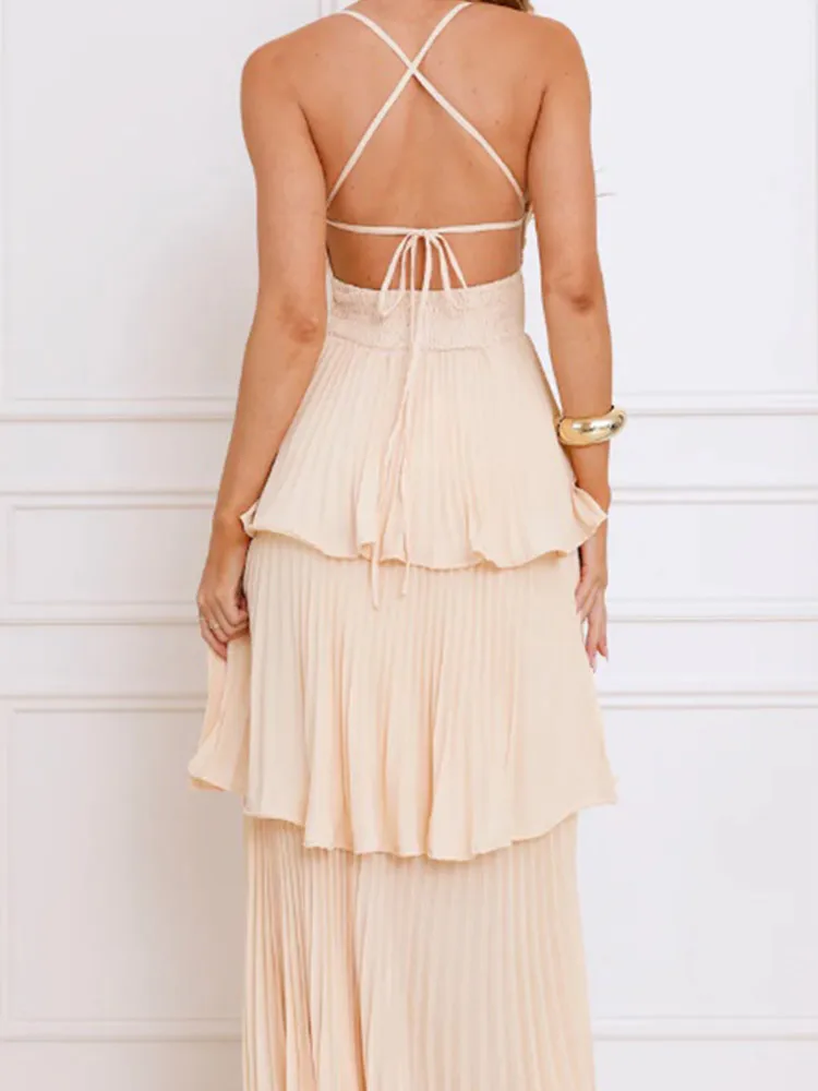 Fleepmart Yellow Sexy V-neck High Waist Long Women Backless Lace Up Multi Layer Maxi Dress 2025 Casual Party Wear