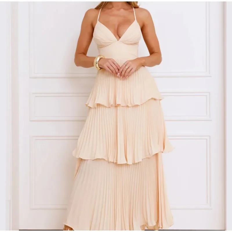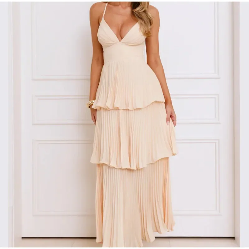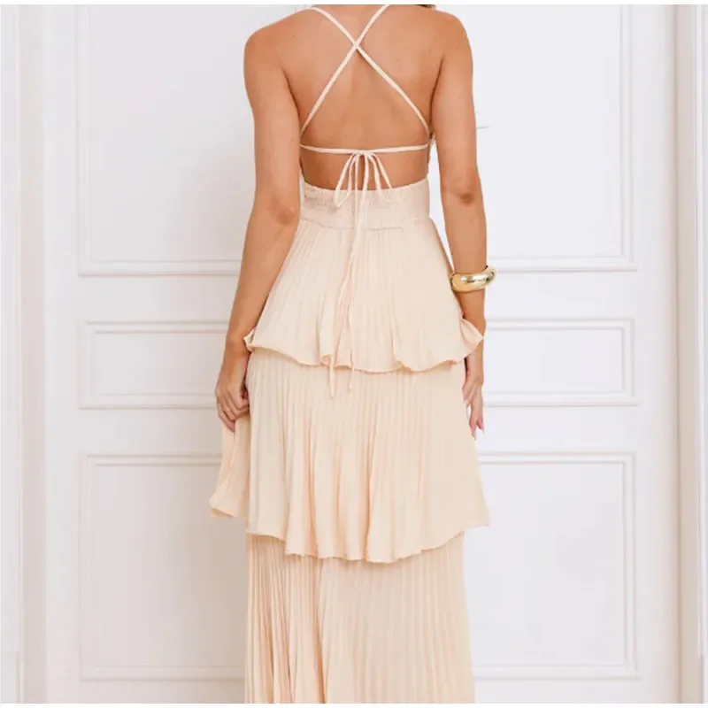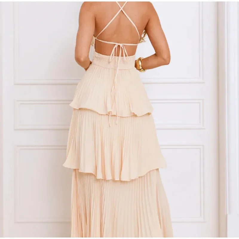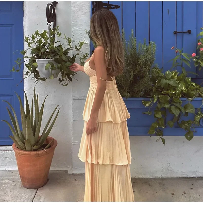 Fleepmart Yellow Sexy V-neck High Waist Long Women Backless Lace Up Multi Layer Maxi Dress 2025 Casual Party Wear