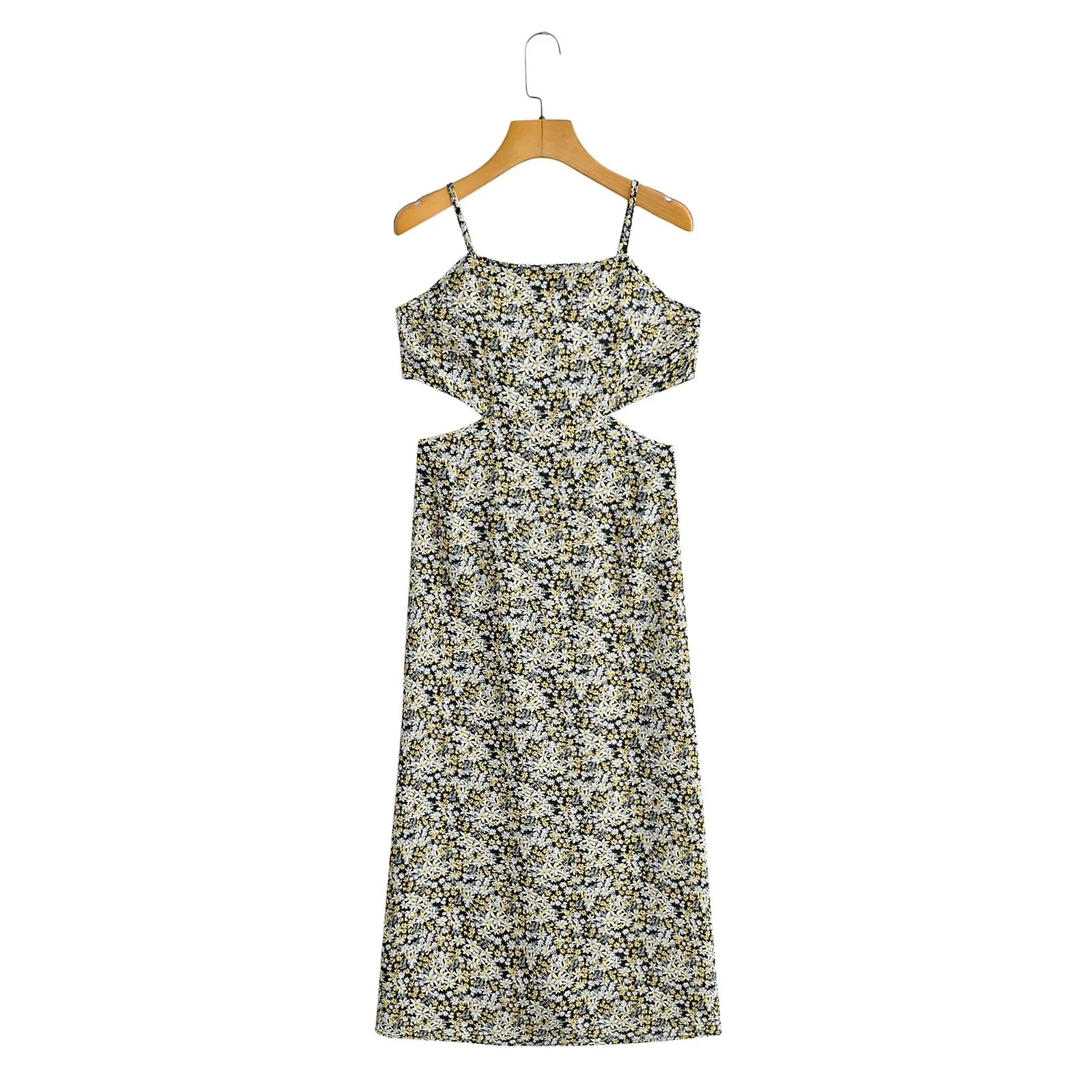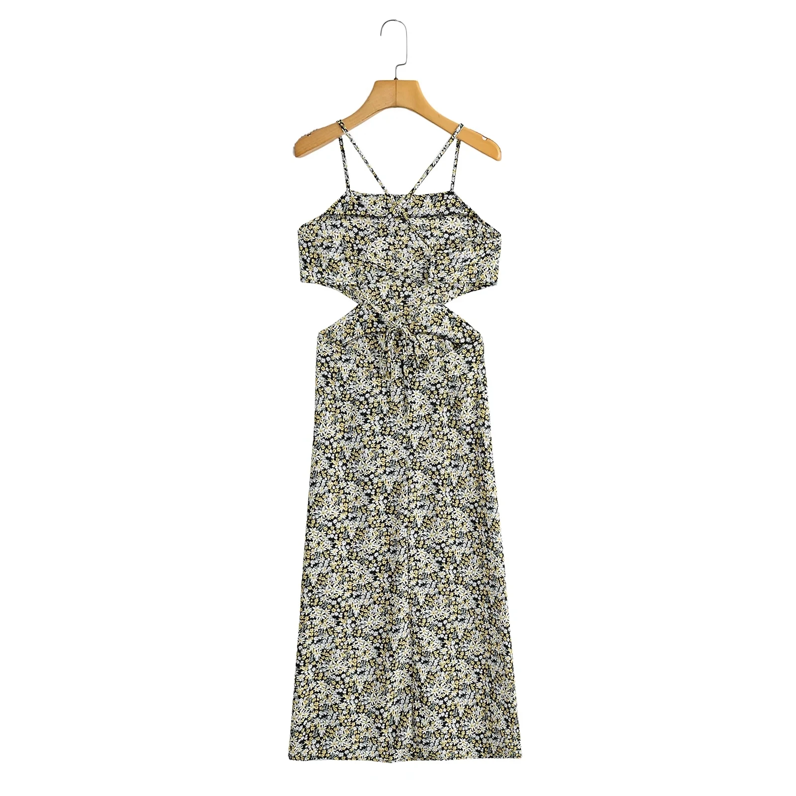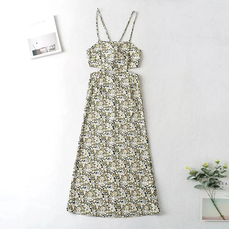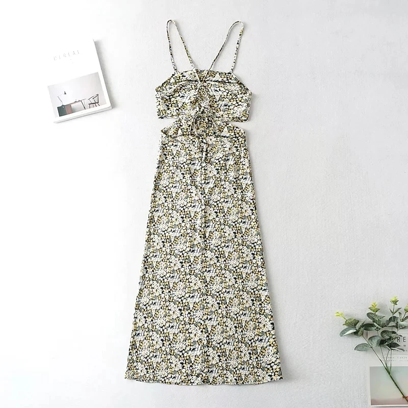 Fleepmrt Gaun Panjang Maxi Boho Gambar Cetak Daisy Gaun Musim Panas Floral Tanpa Lengan Gaun Hitam Tali Spaghetti