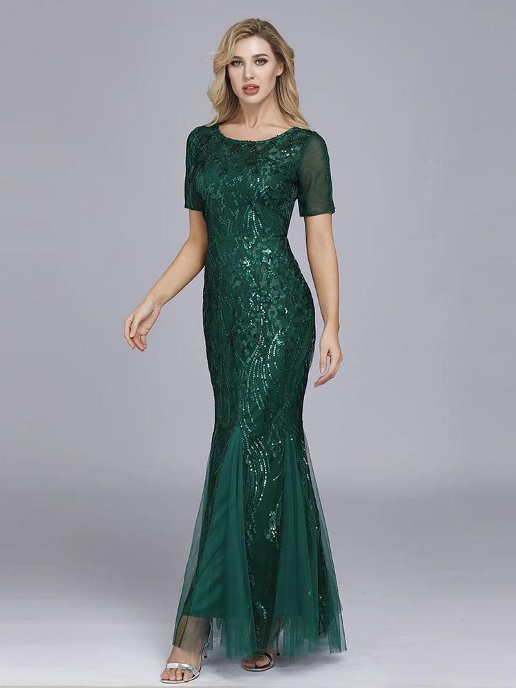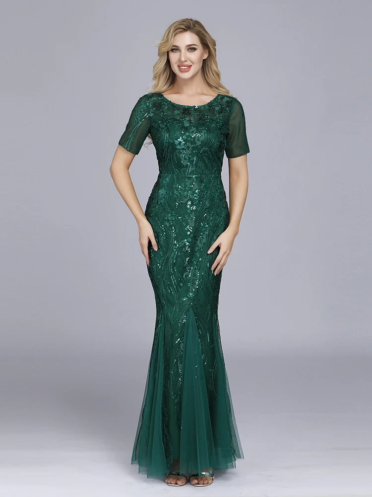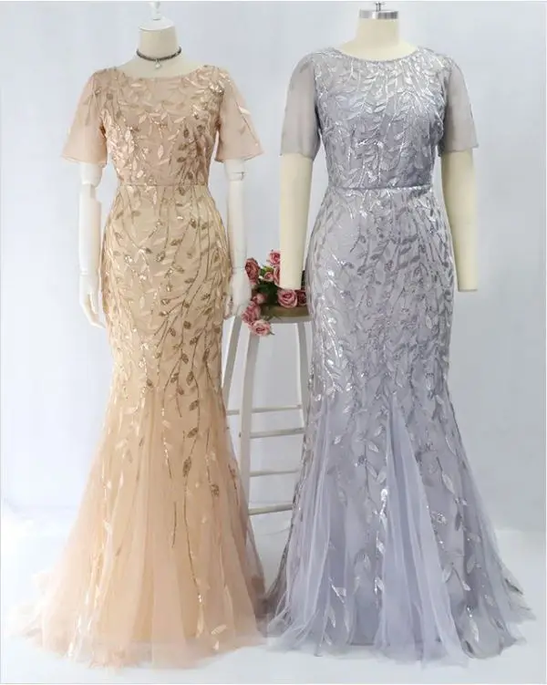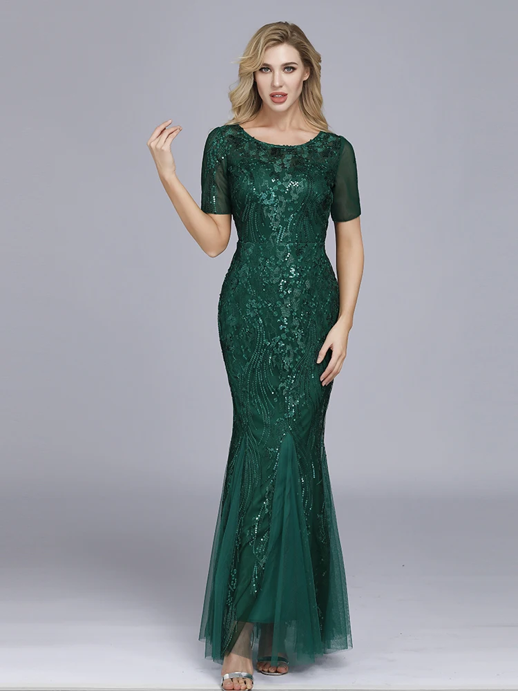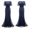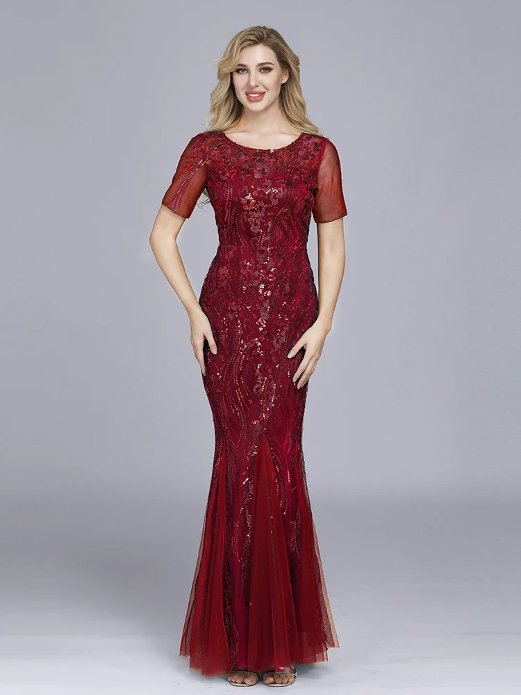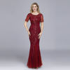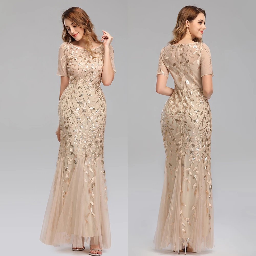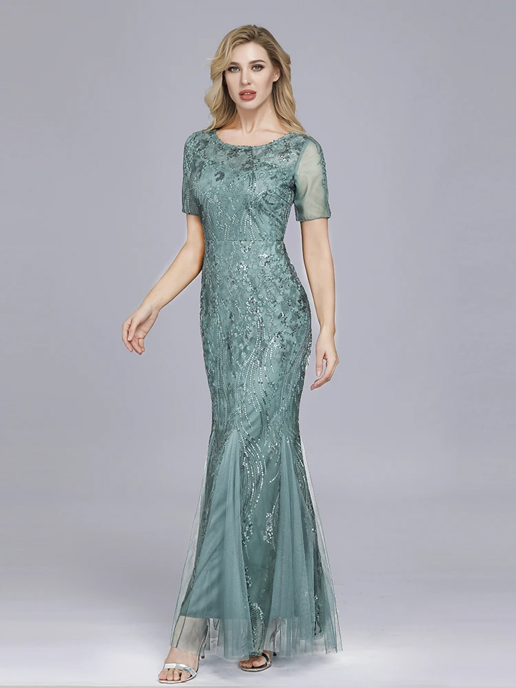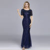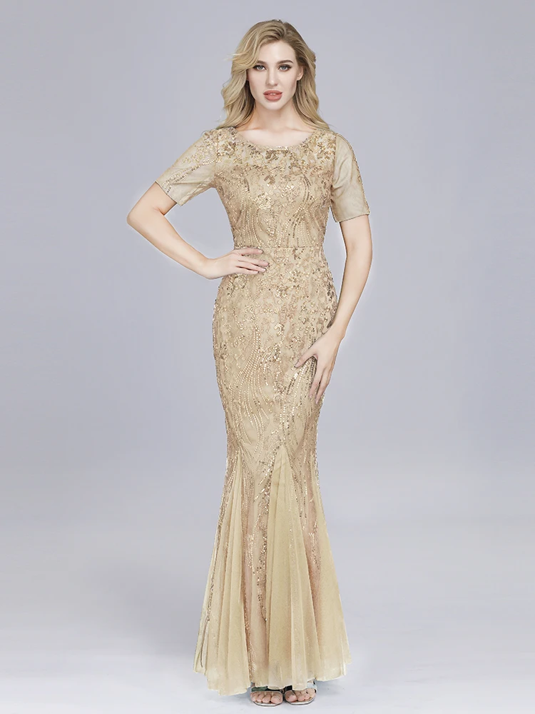 Flepmart Embroidered beaded Fabric Prom Dresses Sugar Color O-Neck Short Sleeve Elegant Little Mermaid Dresses Formal Party Gowns 2021