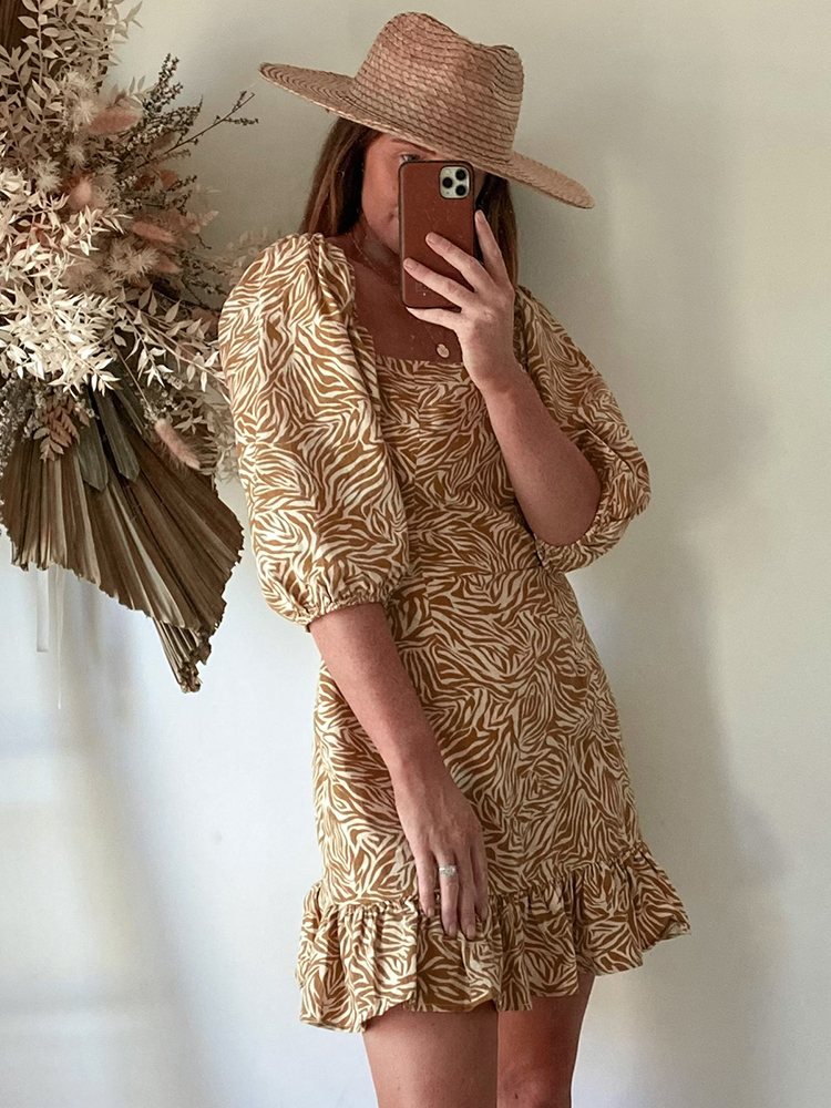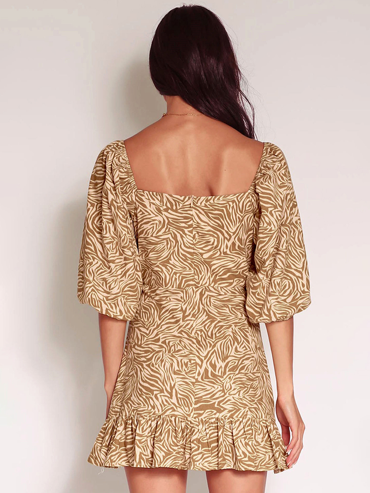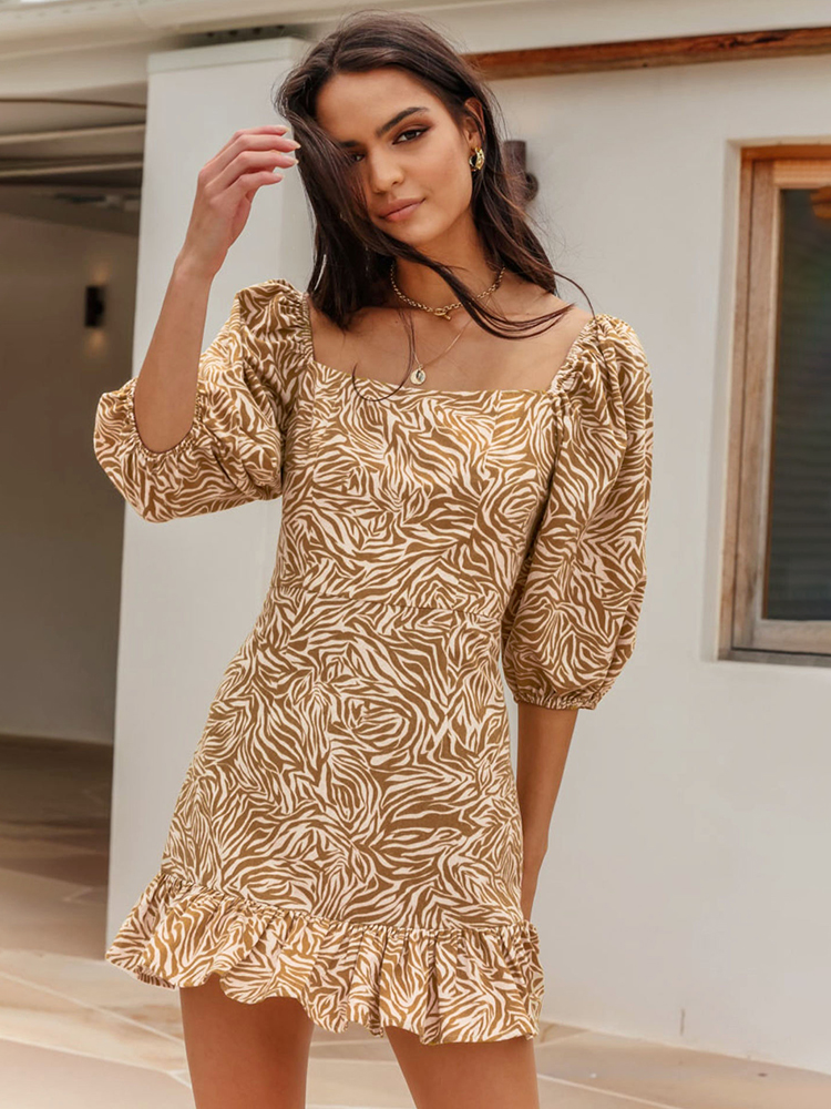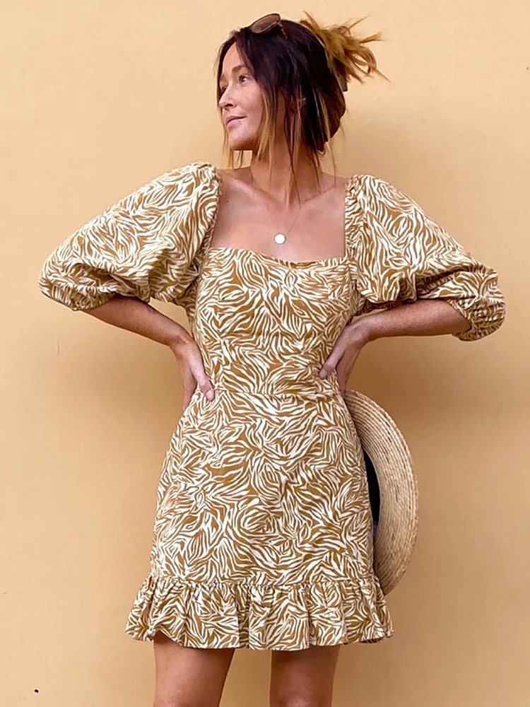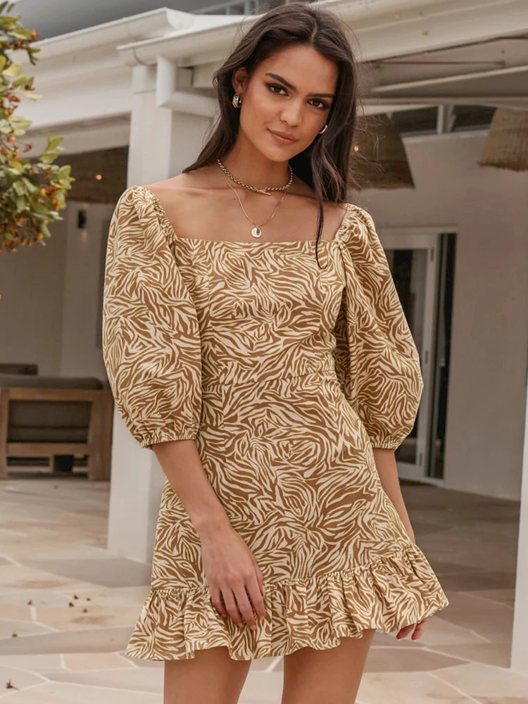 Flepmart Fashion Printed Mini Dresses Women Chic Suqare Collar Puff Sleeve A Line Dress Female Summer Party Dresses Vestidos