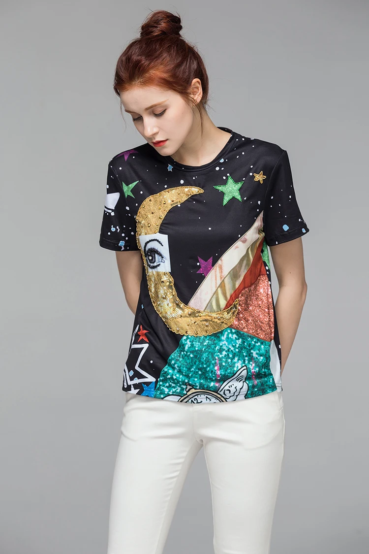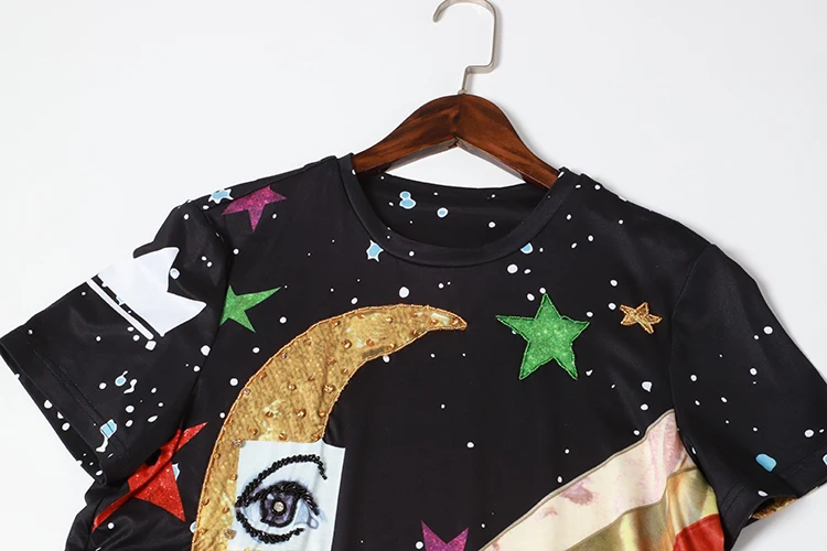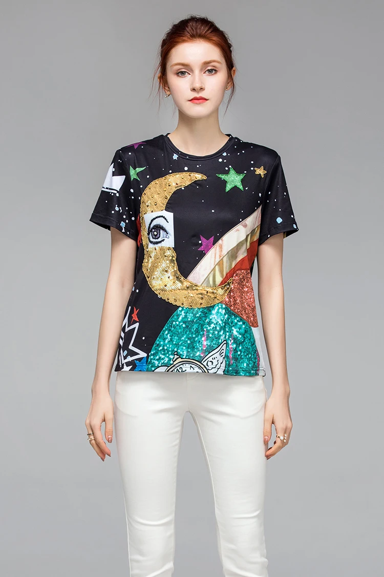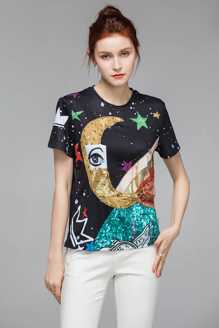 FM 2019 Summer Fashion Women T-shirt Runway Short Sleeve Cartoon Moon Star Printed Luxury Beaded Cotton Tshirt New
