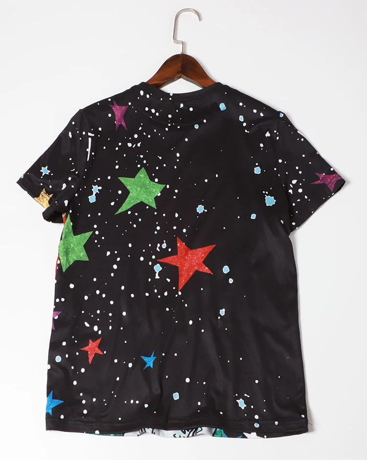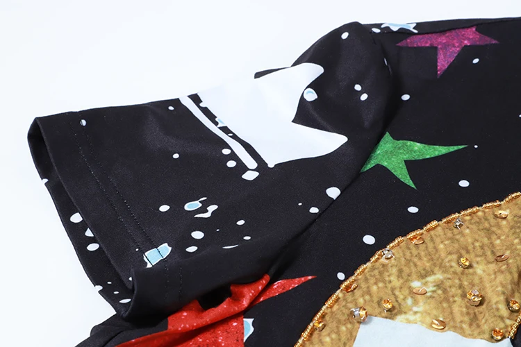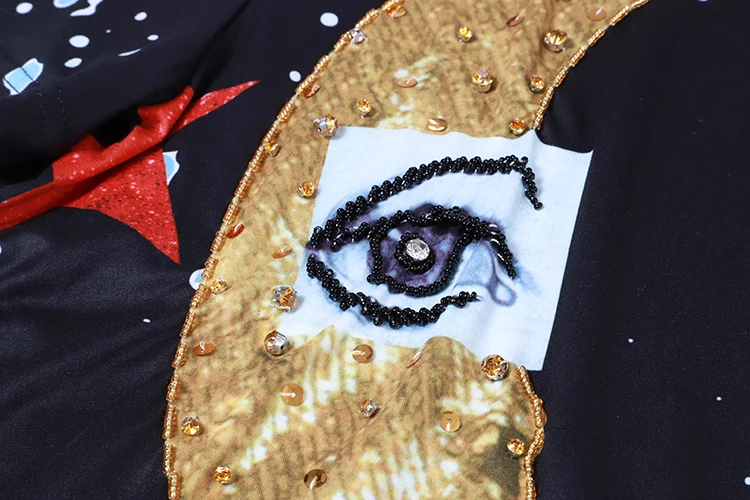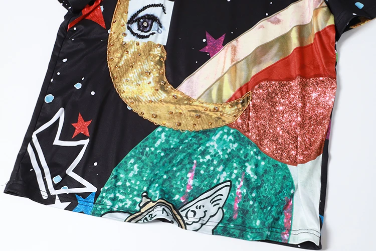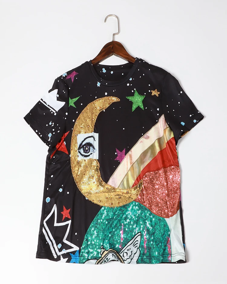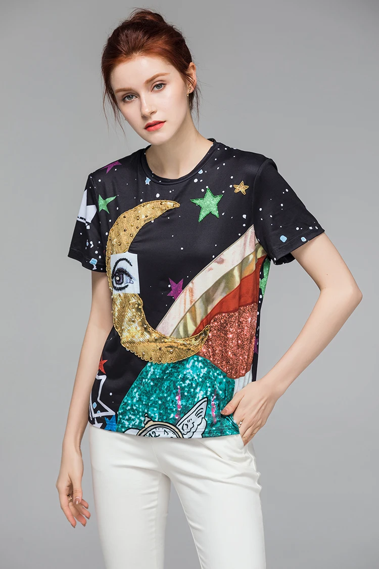 FM 2019 Summer Fashion Women T-shirt Runway Short Sleeve Cartoon Moon Star Printed Luxury Beaded Cotton Tshirt New