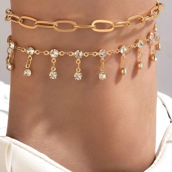 Fleepmart Charms Key Anklet Wafer Shiny Rhinestone Foot Chain Adjustable Bohemian Jewelry Gift for Women Men 2pcs/sets