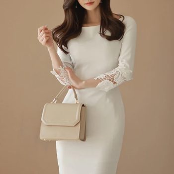 Fleepmart Thick Warm Autumn Winter New Elegant Formal Party Dress Lace Sleeve White Slim Sheath Dress Office Lady Work Spring
