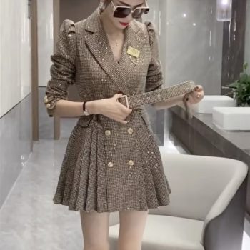 Fleepmart Short Suit Women Autumn European Style Bubble Sleeves High Waist Slimming Pleated Dress