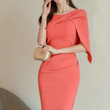 fleepmart 2021 New Elegant Formal Party Dress Rose Pink Cloak Sleeves Bodycon Pencil Dress Club Spring Autumn Winter