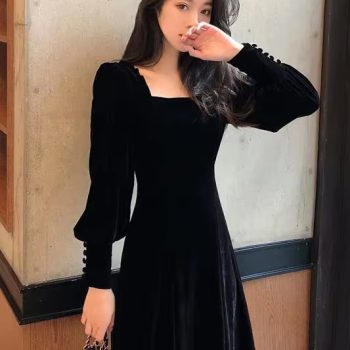 Fleepmart Vintage French Style Red Dress Women’s Slimming Square Collar Long Dress Elegant Autumn winter Waist-fitted
